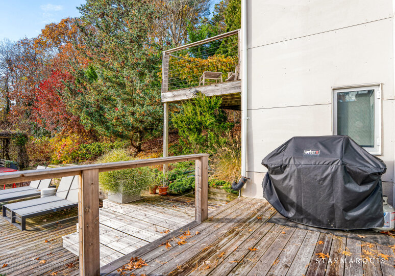 Stepping outside, guests are greeted by complete seclusion and unobstructed views, creating a peaceful sanctuary that feels worlds away from daily life. The property’s elevated position affords gentle breezes, brilliant morning light, and soft pastel evening skies that paint the horizon. A private heated pool runs alongside the home’s rear façade, ideal for swimming laps, sun-soaked afternoons, or unwinding with a cool drink while taking in the water views. The multiple deck areas offer the perfect opportunities for outdoor dining or lounging, transitioning seamlessly from relaxed afternoons to intimate evening gatherings. Surrounded by natural landscaping that preserves the beauty of the original terrain, this outdoor haven feels both purposeful and serene—a place where guests can reconnect, linger over conversation, and find quiet moments of rest.