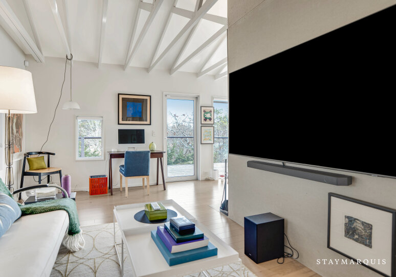 Just beyond, a dedicated den offers a more intimate setting for relaxation and entertainment. Thoughtfully designed as a media space, the den features a large-screen TV and built-in media center, making it ideal for movie nights, catching a game, or unwinding after a day at the beach. Whether used as a quiet escape or a communal gathering space, the den adds flexibility and comfort to the home’s living experience.