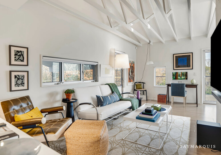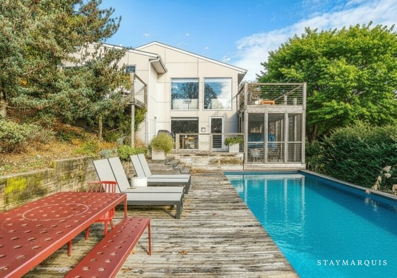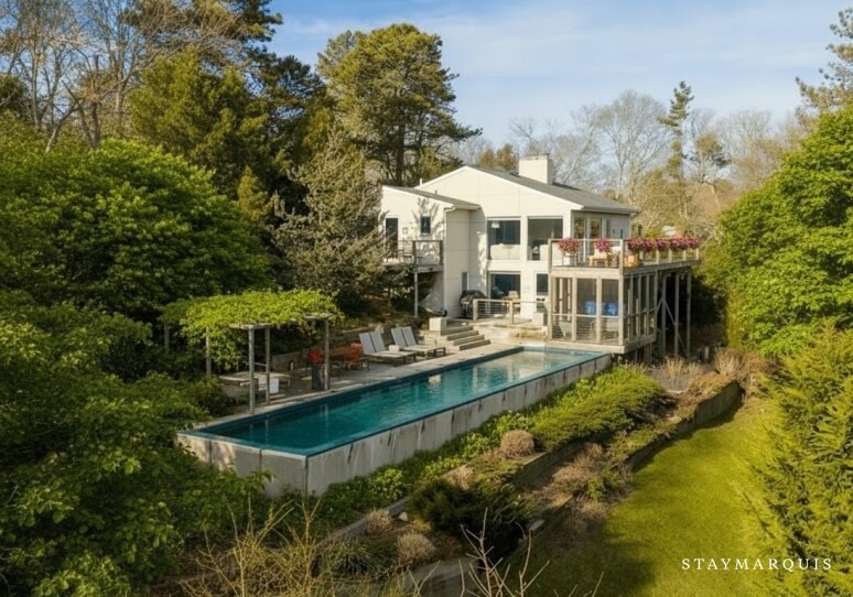 Perched in the serene hills of Shinnecock, this modern Southampton property offers an elevated retreat defined by sweeping nature views, refined architecture, and effortless indoor–outdoor living. With 4 bedrooms and 3 bathrooms, the home welcomes up to six guests into an atmosphere of total relaxation and contemporary elegance. Its open floor plan showcases an abundance of natural light, captured through expansive glass windows that frame the lush tree line and the shimmering water beyond. Stretching across the full length of the property, a striking modern pool anchors the rear of the home—an exquisite backdrop that immediately sets the tone for a soothing, sophisticated escape. Designed for couples, small groups of friends, and families seeking tranquility and connection, this Southampton hideaway offers the perfect blend of privacy, comfort, and style.