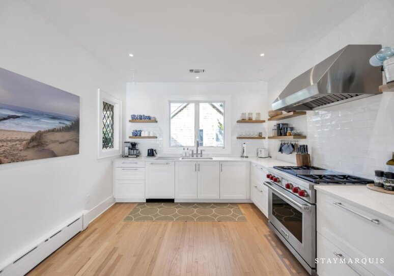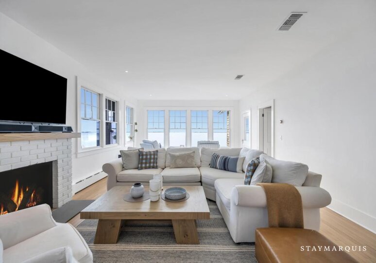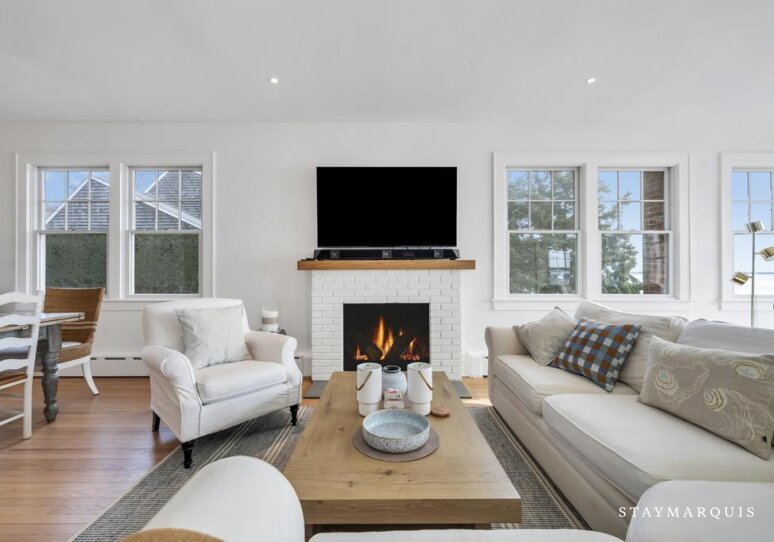 Inside, the tour begins in the bright, open living area where natural light floods through oversized windows, framing views of the water and infusing the space with warmth. The open layout allows for a seamless flow from the living room—complete with a charming wood-burning fireplace—to the dining area and into the well-equipped gourmet kitchen. Here, guests will find top-of-the-line appliances, a coffee maker for slow, cozy mornings, and everything needed to prepare memorable meals at home. Modern comforts are thoughtfully integrated: high-speed Wi-Fi keeps guests connected, central AC maintains ideal temperatures throughout the seasons, and a full washer and dryer provide convenience during longer stays. Every corner of the home is crafted to feel welcoming, easy, and intuitively designed for relaxation.