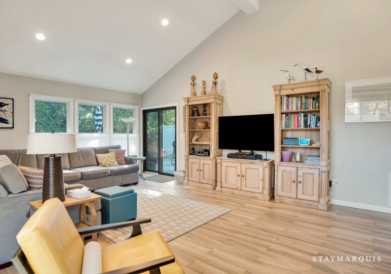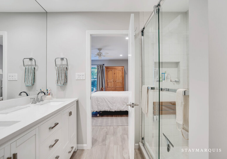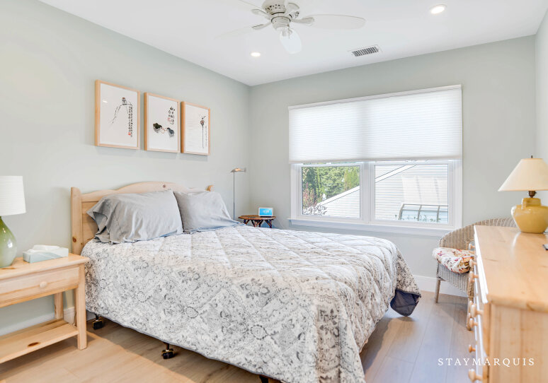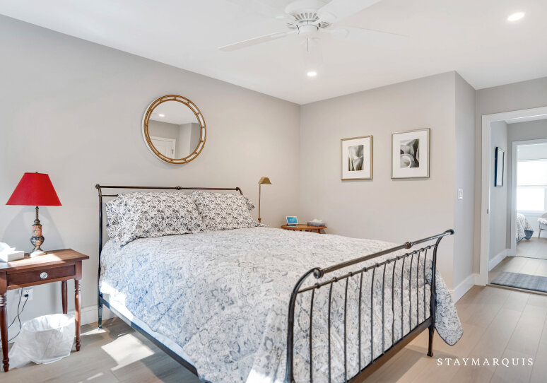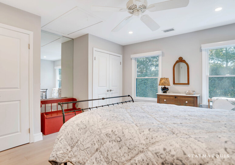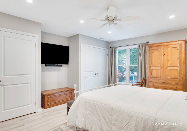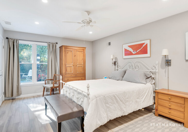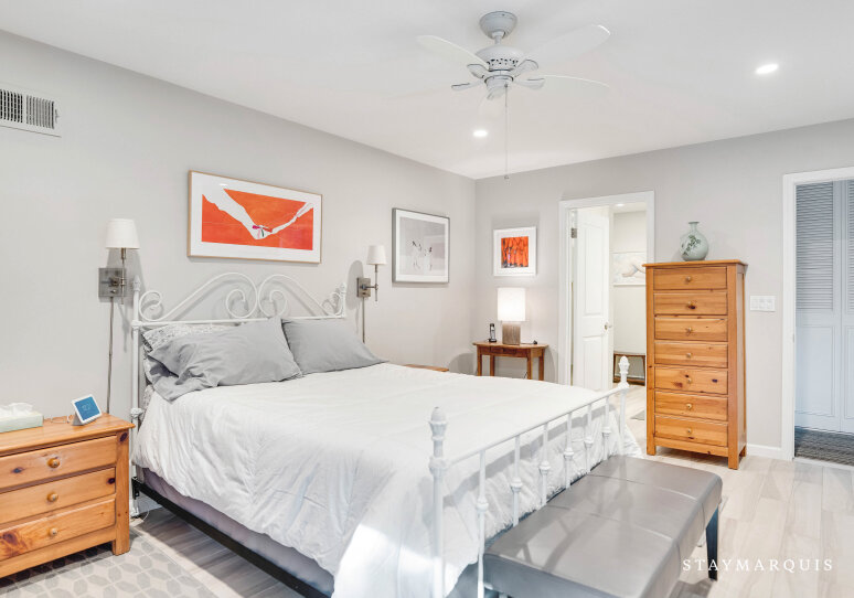 Upstairs and down, the sleeping quarters offer serenity and privacy for every guest. The main floor hosts the primary bedroom, a peaceful retreat featuring an ensuite bath and direct access to the home’s common areas—perfect for early risers or anyone seeking a bit of quiet before the day begins. On the second floor, three additional guest bedrooms share a well-appointed hall bath, providing plenty of space for family or friends to unwind. A third full bathroom on the main level ensures that all guests have the convenience and comfort they need. Each bedroom is tastefully furnished with soft linens, ample storage, and restful décor that complements the home’s warm, coastal aesthetic.