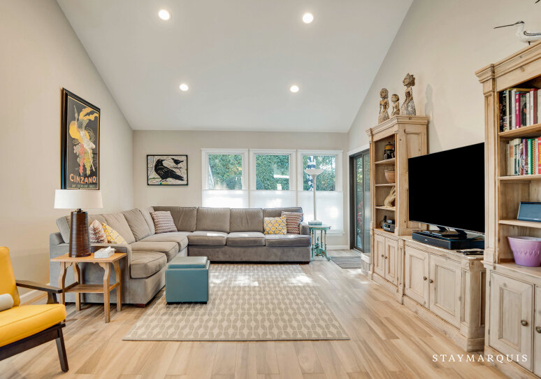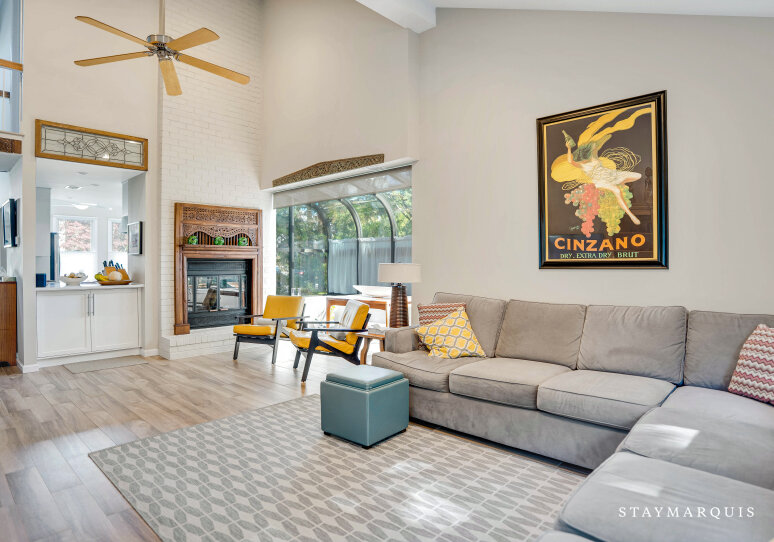 Inside, the home’s traditional floor plan has been designed to foster togetherness and flow. A welcoming foyer opens into the formal living room, where tall vaulted ceilings and abundant natural light create a bright, airy ambiance. Oversized windows and sliding glass doors blur the lines between inside and out, filling the space with sunshine and offering direct access to the patio for seamless indoor-outdoor entertaining. The adjoining dining area is ideal for casual breakfasts or elegant dinners, while the modern kitchen is fully equipped with all the essentials—stainless appliances, ample counter space, and thoughtful touches for those who love to cook and gather. Every detail has been designed with comfort and convenience in mind, from the central air conditioning and high-speed WiFi to the in-home washer and dryer.