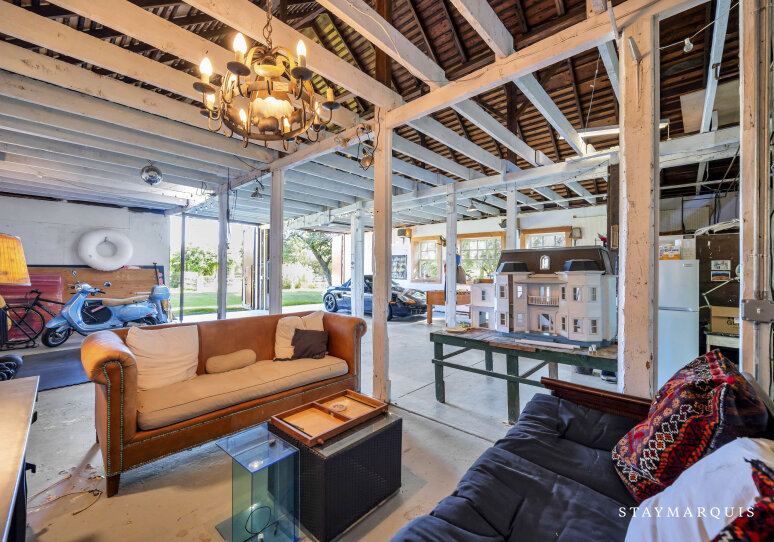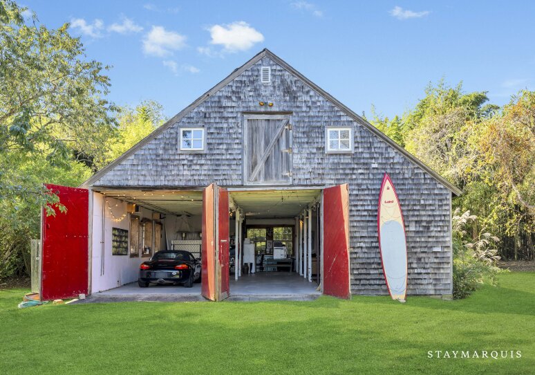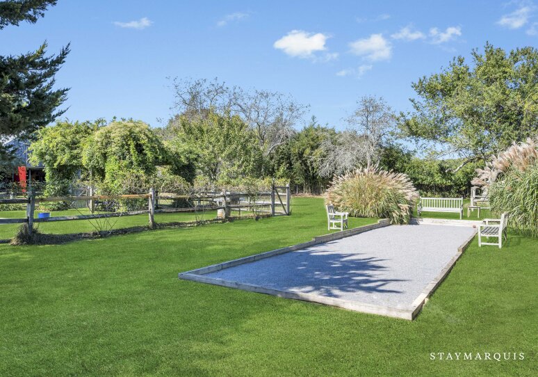 Outdoors, the private, gated grounds unfold across a sweeping lawn wrapped in greenery, creating an atmosphere of total seclusion. At the center, the fenced-in pool invites hours of lounging, while a shaded pergola provides a breezy spot for alfresco dining. An outdoor shower near the pool offers a refreshing rinse after swimming or beach days, and outdoor speakers and a gas grill make gatherings effortless. A bocce court adds a playful touch, while multiple fire pits surrounded by Adirondack chairs create cozy spaces for cocktails as dusk settles in. The wraparound wooden deck—spanning over 100 feet—extends directly from the main living areas, offering multiple lounges and shaded dining tables for everything from morning coffee to dinner parties. A tucked-away garden with a bistro table invites quiet moments, and a converted barn outbuilding serves as a flexible retreat with an exercise area, lounge, game room, and workstation. With a private driveway, ample parking, and wide stretches of lawn, the estate balances resort-style amenities with the intimacy of a private residence.