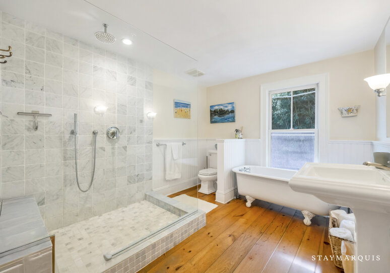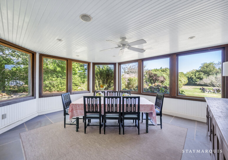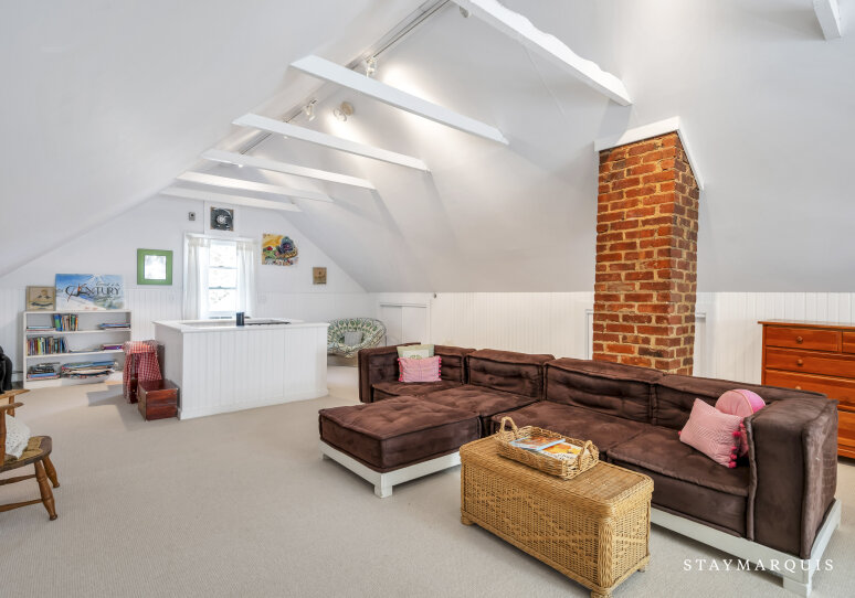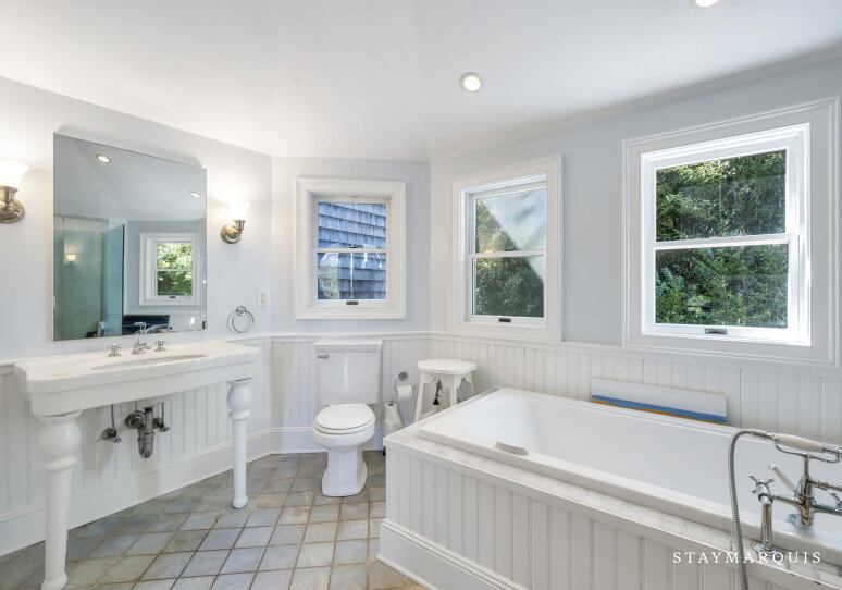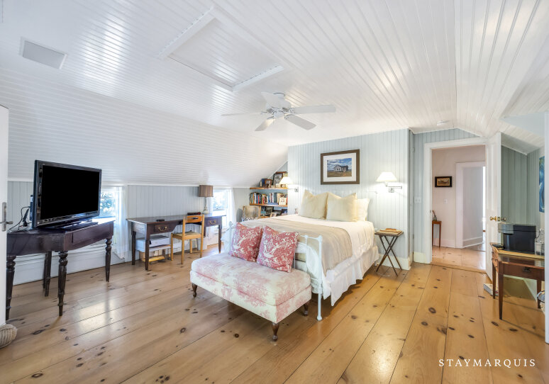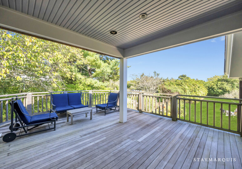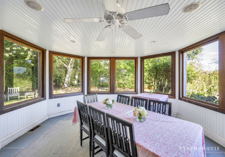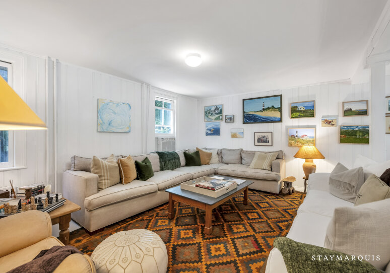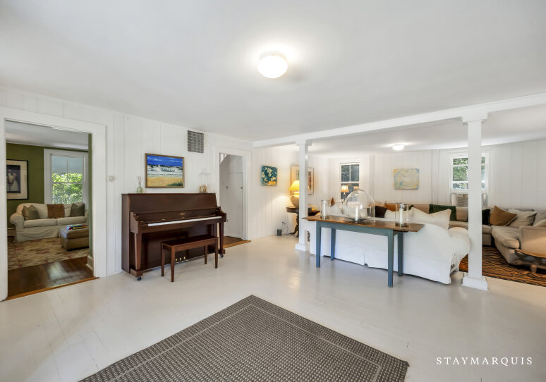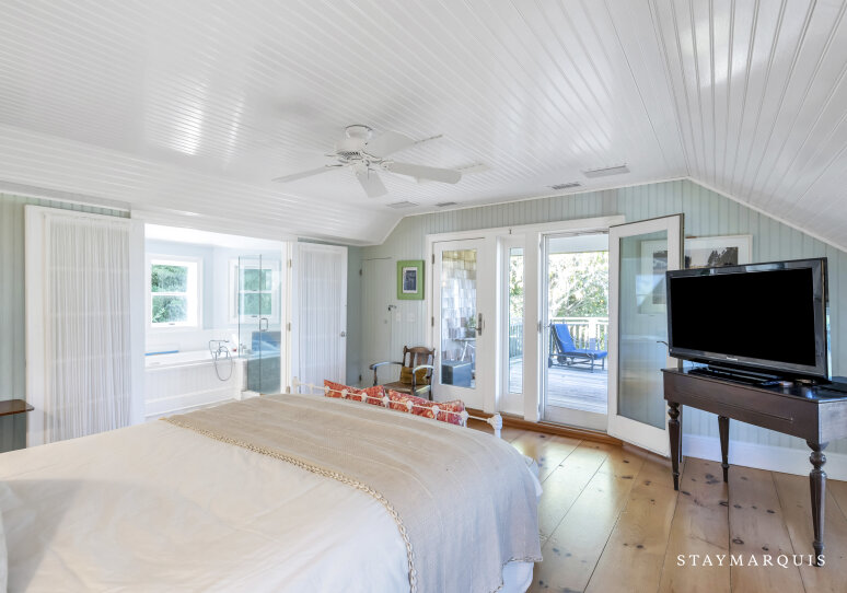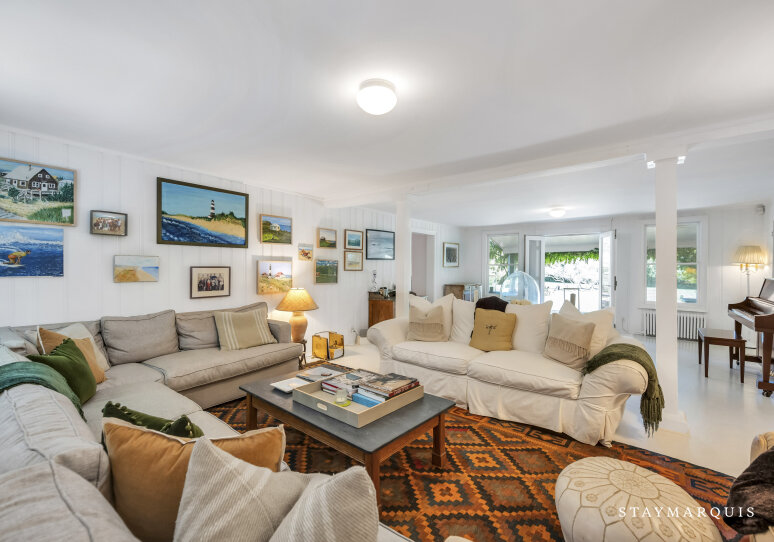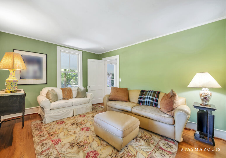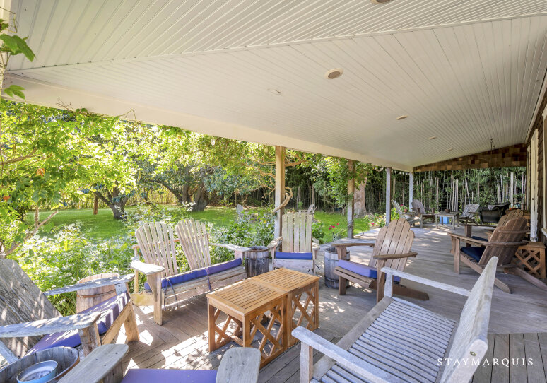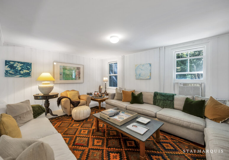 Inside, the home’s traditional floor plan welcomes guests into bright, inviting spaces for gathering and unwinding. Classic furnishings, curated artwork, and soft tones create a timeless atmosphere. The main living room centers around a cozy fireplace, while a TV den and sunroom offer relaxed spaces for reading or movie nights. Doors open seamlessly to the back deck, reinforcing the home’s signature indoor-outdoor flow. The chef’s kitchen features top-of-the-line appliances, a wine fridge, and everything needed for gourmet cooking. Meals can be enjoyed in the sunlit dining room overlooking the garden. Modern comforts—WiFi, air conditioning, laundry, and a dedicated work area—ensure the estate is as practical as it is inviting.