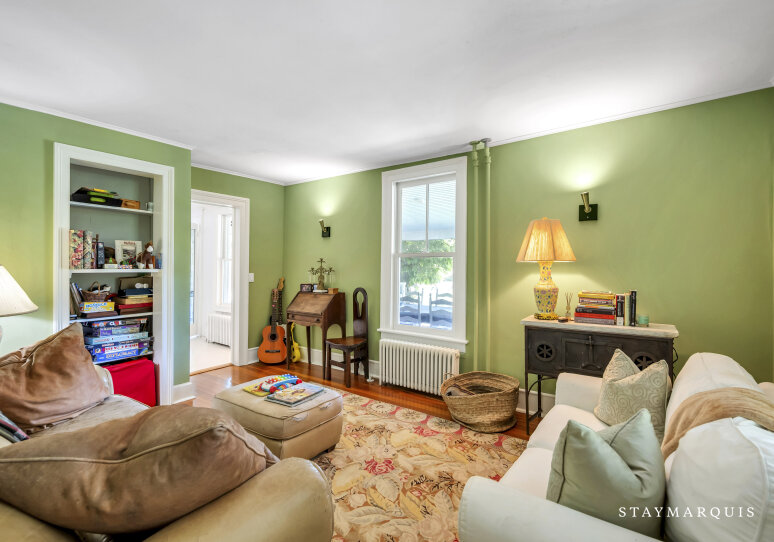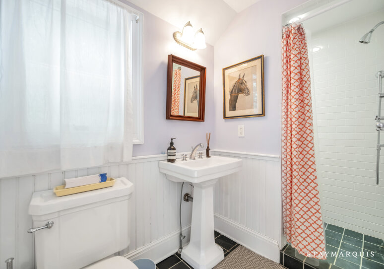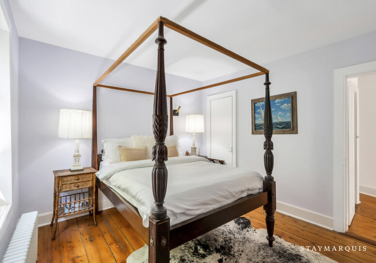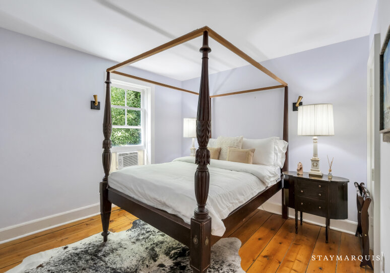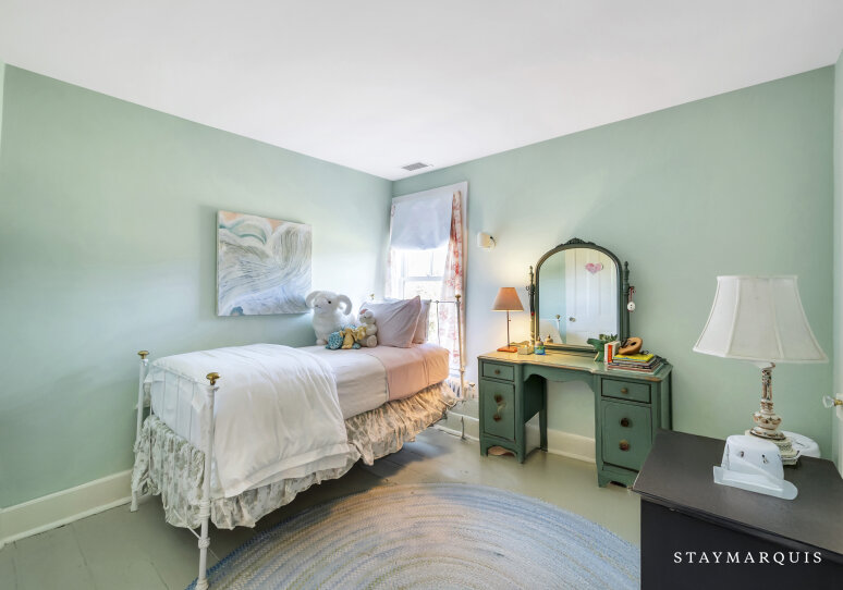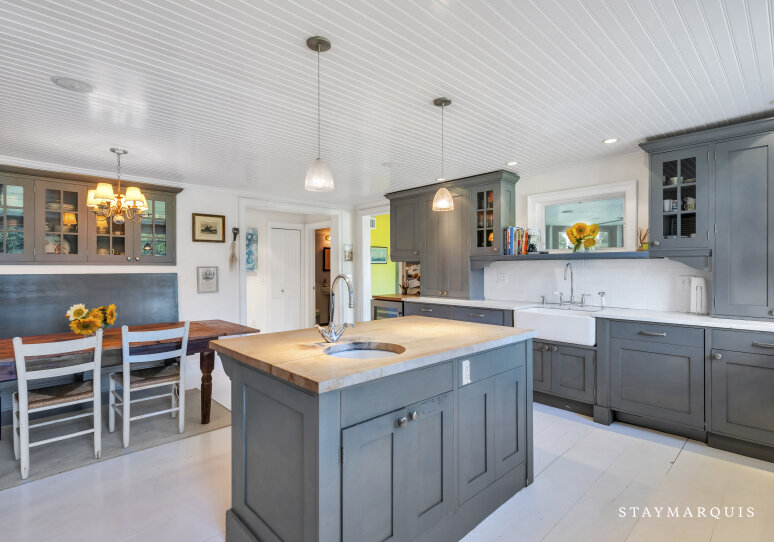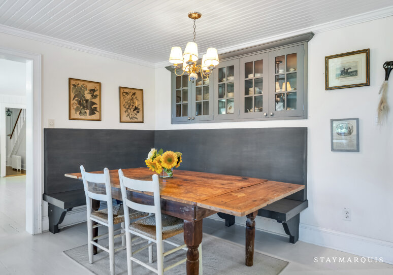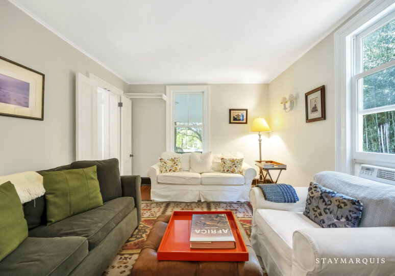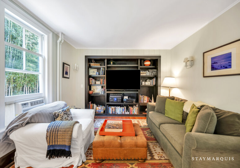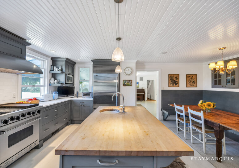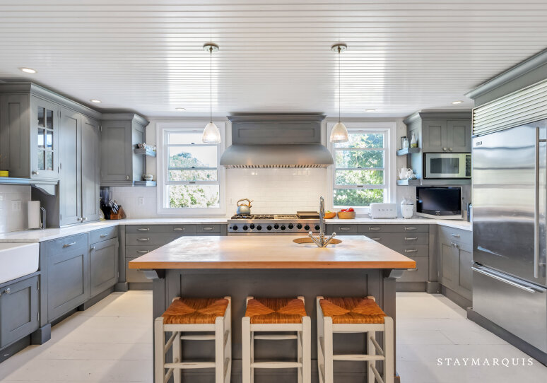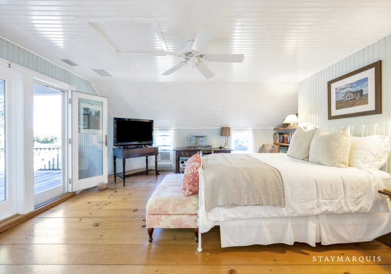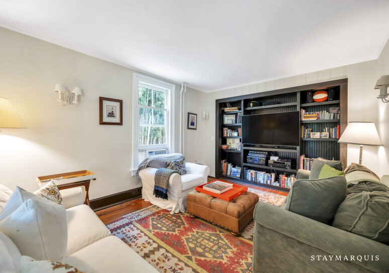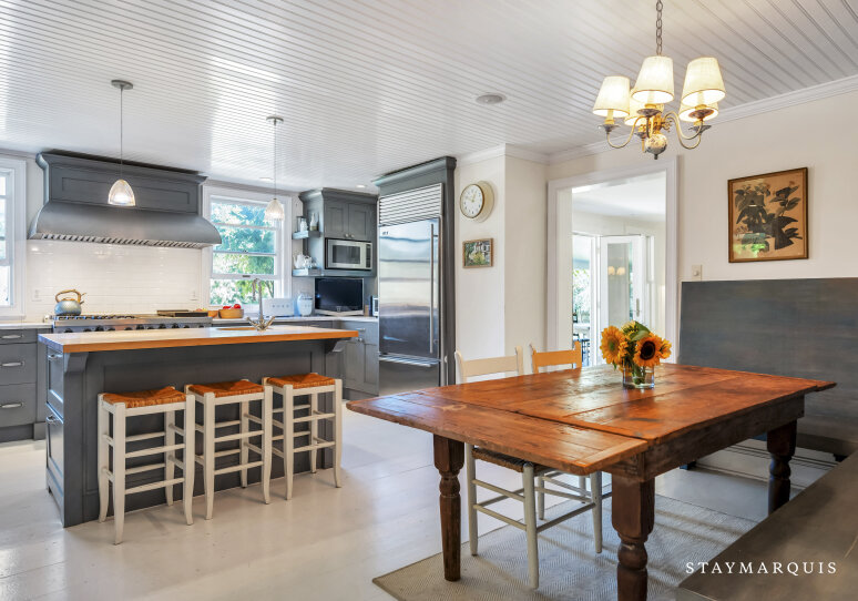 Inside, the home’s traditional floor plan welcomes guests into bright, inviting spaces for gathering and unwinding. Classic furnishings, curated artwork, and soft tones create a timeless atmosphere. The main living room centers around a cozy fireplace, while a TV den and sunroom offer relaxed spaces for reading or movie nights. Doors open seamlessly to the back deck, reinforcing the home’s signature indoor-outdoor flow. The chef’s kitchen features top-of-the-line appliances, a wine fridge, and everything needed for gourmet cooking. Meals can be enjoyed in the sunlit dining room overlooking the garden. Modern comforts—WiFi, air conditioning, laundry, and a dedicated work area—ensure the estate is as practical as it is inviting.