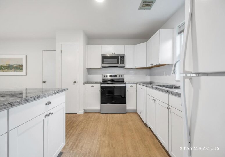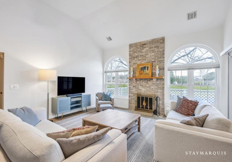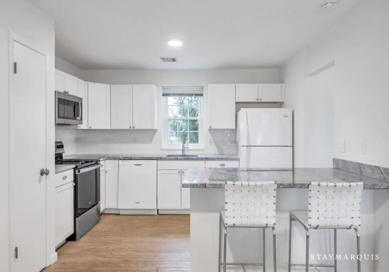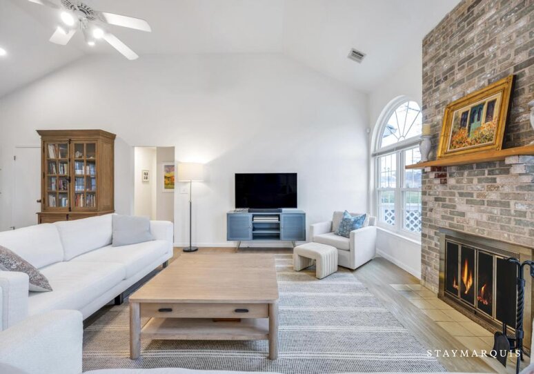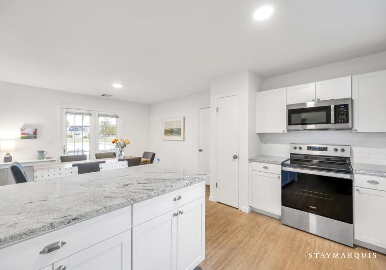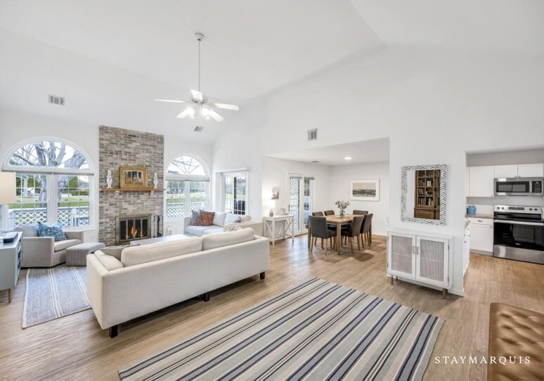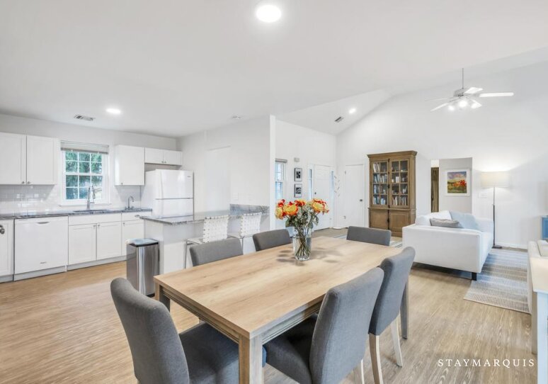Inside, the home is an inviting blend of modern design and comfort, with an open layout that maximizes natural light and flow. The living spaces are carefully curated for both relaxation and social connection, with plush seating perfect for unwinding or gathering with friends and family. High-speed Wi-Fi keeps guests connected, while central air conditioning ensures comfort no matter the season. The property also includes a washer and dryer for added convenience. The recently renovated kitchen is a true centerpiece of the home featuring sleek wood cabinetry, and a professional-grade coffee maker. Its open design allows cooks and guests alike to interact seamlessly, whether preparing a casual breakfast or a refined dinner. The dining area flows effortlessly from the kitchen, providing the ideal setting for shared meals, lively conversation, or quiet moments over a glass of wine.
