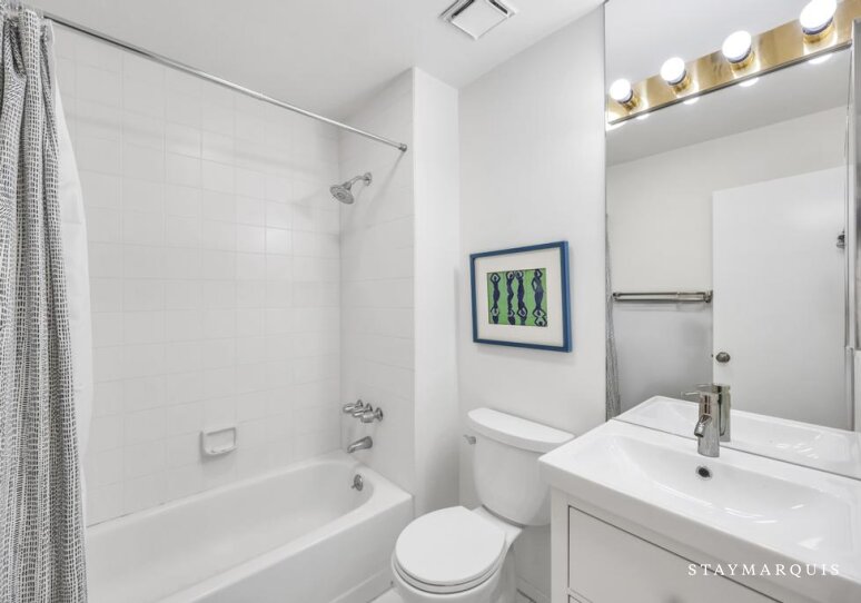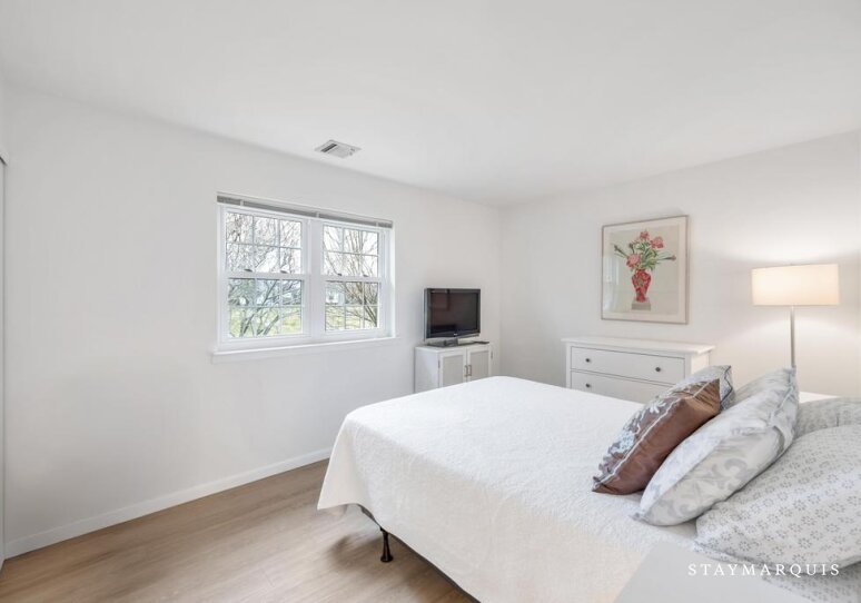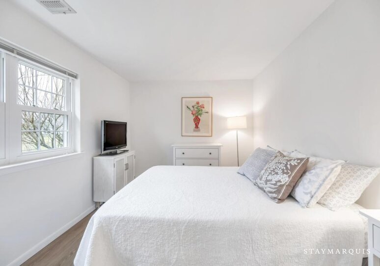 The two bedrooms offer a serene escape at the end of the day, each thoughtfully furnished with fresh, high-quality linens and a calming color palette. Both bathrooms are equipped with all the essentials and traditional fixtures that blend style and functionality, ensuring guests can refresh and rejuvenate with ease. Every detail has been considered, from plush towels to elegant lighting, creating spaces that feel both luxurious and inviting. The bedrooms provide a restful retreat, perfect for unwinding after a day spent enjoying the area’s many offerings.