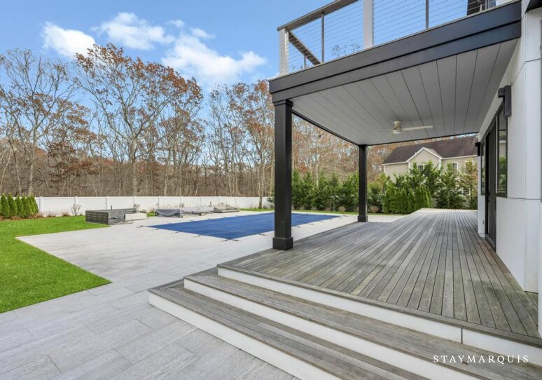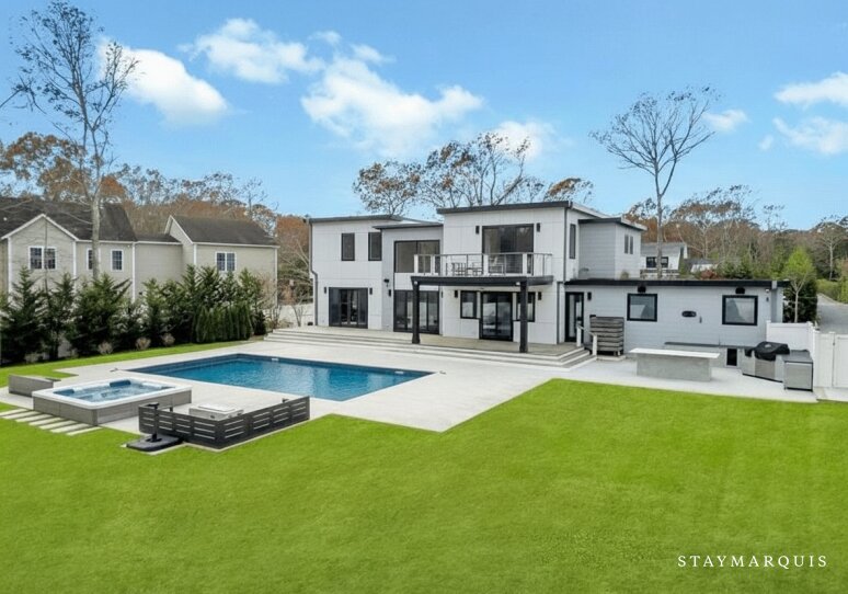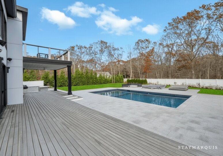 Tucked away on a quiet private lane in Southampton, this modern, secluded poolside retreat offers sophisticated travelers a serene escape shaped by sunlight, comfort, and effortless indoor–outdoor living. With a spacious open floor plan, five beautifully appointed bedrooms, and five-and-a-half well-designed bathrooms—as well as an office with a sleeper sofa—the home comfortably accommodates up to eight guests. From the moment guests step inside, they are welcomed by bright, expansive living spaces with multiple sitting and dining areas that invite connection, relaxation, and the simple pleasure of slowing down. Outside, a generous deck becomes the center of daily life, whether guests begin their mornings with coffee overlooking the pool or end the day unwinding in the warm, bubbling hot tub. The elevated outdoor cooking area—with a gas grill and abundant seating—sets the perfect stage for alfresco dinners beneath the summer sky. An outdoor shower offers the quintessential Hamptons touch, refreshing after a dip in the pool or a day exploring nearby beaches. Designed for family gatherings, group retreats, or friends seeking a quiet sanctuary, the property promises both luxury and ease in a beautifully secluded setting.