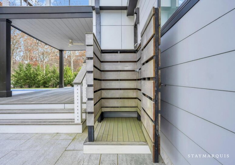 The exterior of the home is nothing short of a private oasis. Total privacy envelops the grounds, creating a peaceful environment where guests can fully disconnect from the pace of everyday life. The heated pool sits at the heart of the outdoor space, surrounded by a stunning deck that encourages lingering afternoons in the sun and relaxed evenings under starlit skies. Loungers, shaded seating areas, and multiple outdoor dining spots offer endless ways to enjoy the warm Southampton weather. Whether soaking in the hot tub after a long day, rinsing off in the outdoor shower, or sprawling out on the deck with a book and a cool drink, guests will find that every corner of the property is designed for pure comfort and tranquility. The seamless blend of nature, modern design, and thoughtful amenities turns this home into a true private resort.