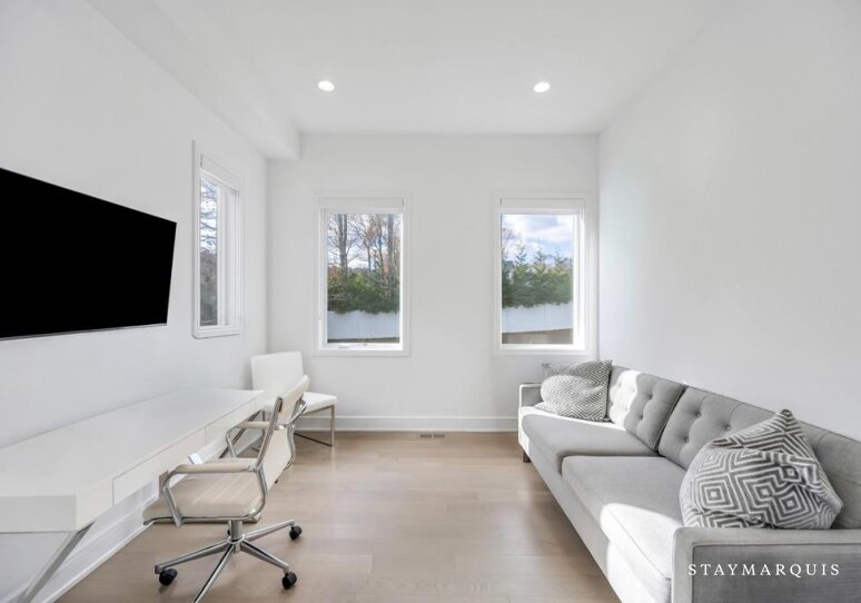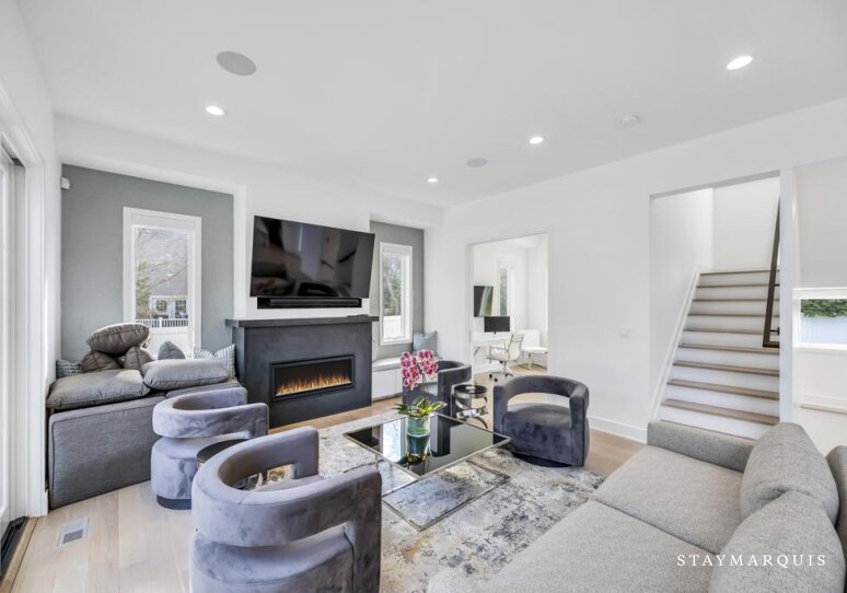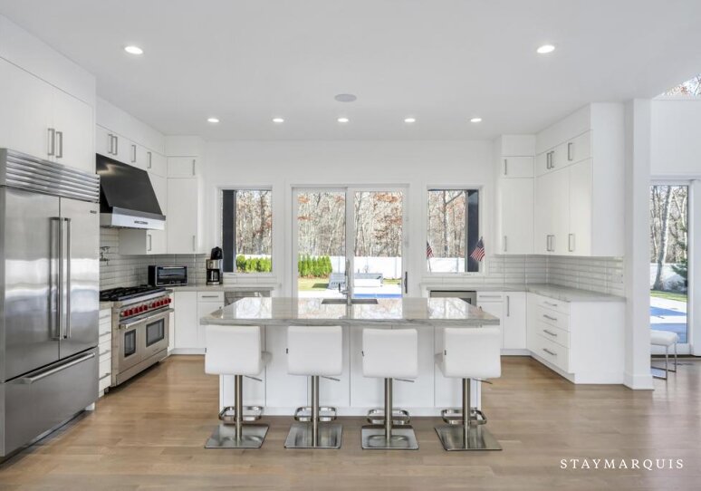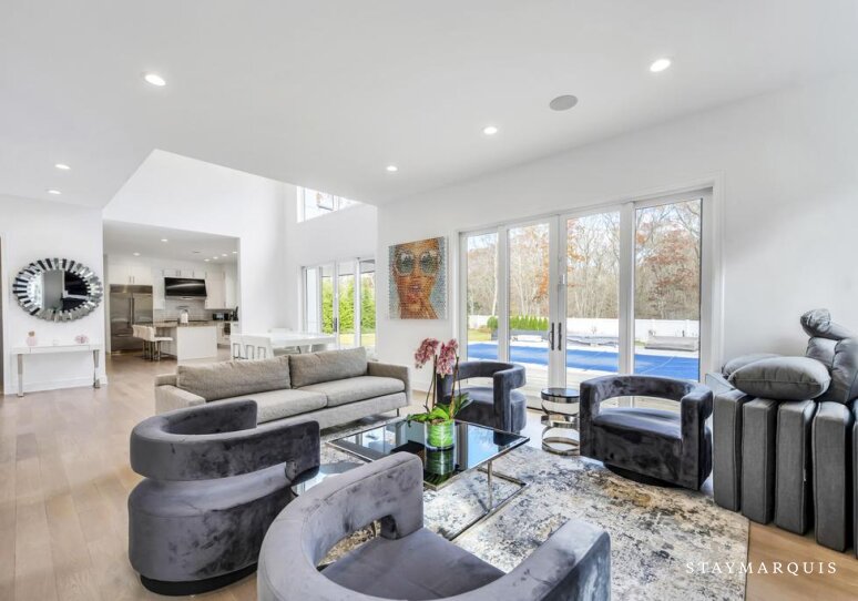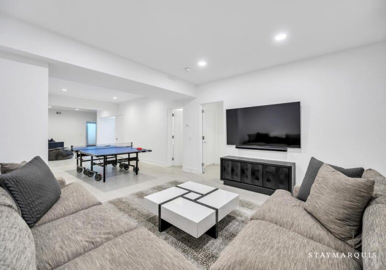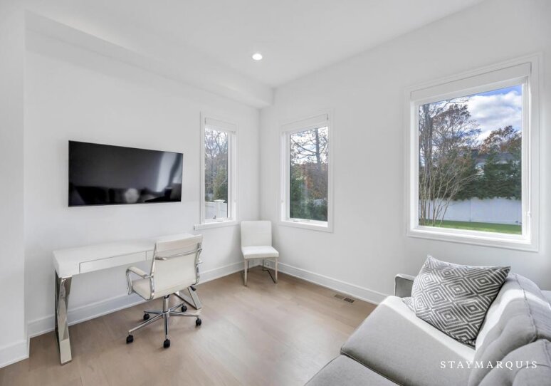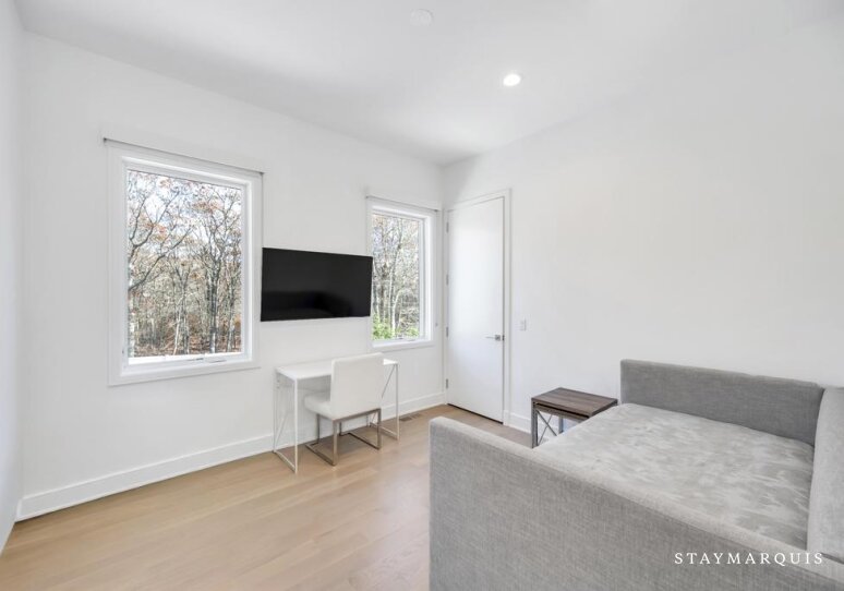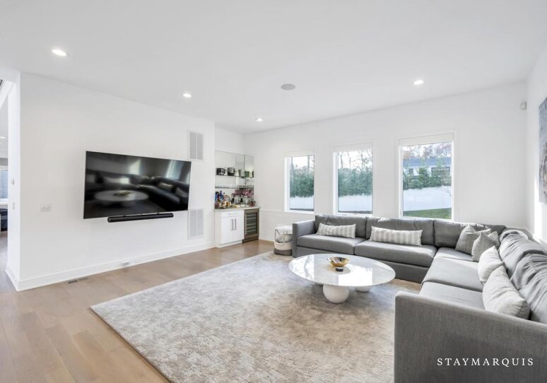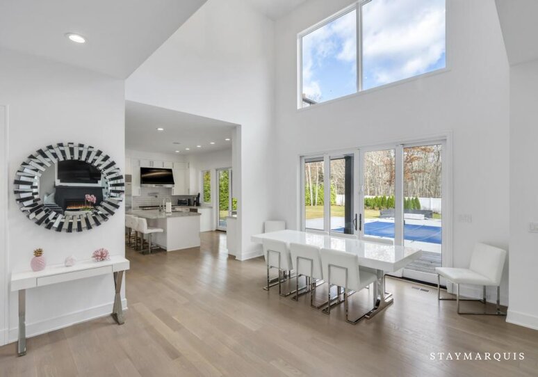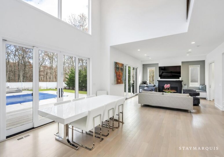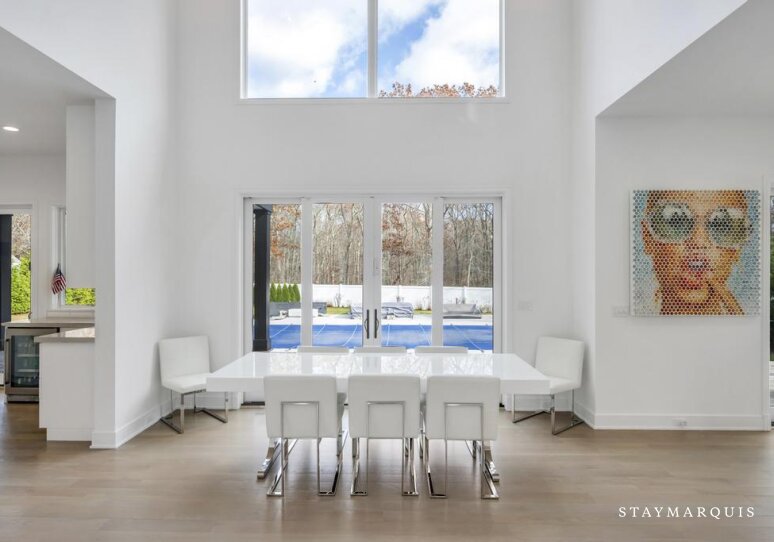 Inside, the home continues its focus on space, light, and easy flow. Central AC ensures year-round comfort, while large windows and sliding doors fill the rooms with natural light and connect the interior with the surrounding landscape. The open layout effortlessly guides guests from the inviting living room to the elegant dining room and onward to the gourmet island kitchen—a highlight of the home. Outfitted with top-of-the-line appliances, a wine cooler, and an ice machine, the kitchen is fully equipped for everything from simple breakfasts to celebratory dinners. Fresh linens, plush bedding, and high-quality essentials are provided throughout, offering hotel-level comfort with the warmth of a private residence. The spacious bedrooms create peaceful sanctuaries for rest, while a secondary living room offers additional space for reading, lounging, or quiet moments. The lower level adds yet another layer of enjoyment and convenience, featuring a ping pong table for friendly competition, a fully equipped gym. The dedicated workspace ideal for guests who may need to balance relaxation with remote work. Every detail has been considered to ensure that guests feel completely at home while still experiencing the luxuries of an upscale Hamptons getaway.