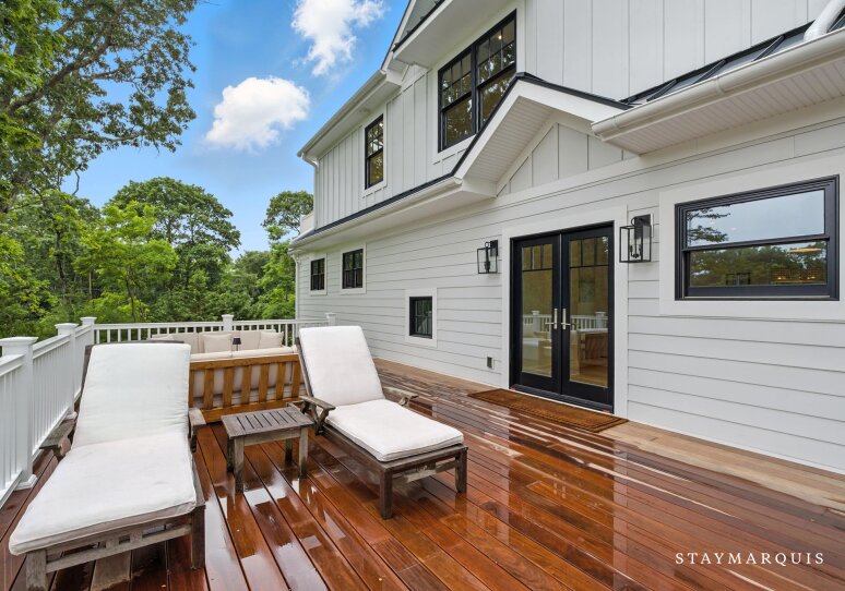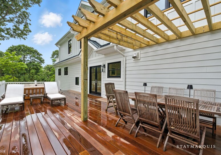 Stepping outside, guests are greeted by a resort-style outdoor sanctuary—expansive, serene, and designed for lingering in the sun. A fully fenced yard offers complete privacy, enveloping the space in quiet calm, while lush green lawn stretches out for games, lounging, and soaking in the summer breeze. Outdoor living takes center stage here: chic sofas for afternoon relaxation, chaise lounges for basking in the sunshine, and a generous outdoor dining setup beside a gas grill for effortless cookouts. Whether hosting sunset cocktails, enjoying a leisurely weekend brunch, or unwinding after a day at the beach, the backyard creates the quintessential Hamptons vacation setting. With ample free parking, beach gear at hand, and plenty of room for everyone to spread out, the home makes coastal living feel easy and luxurious.