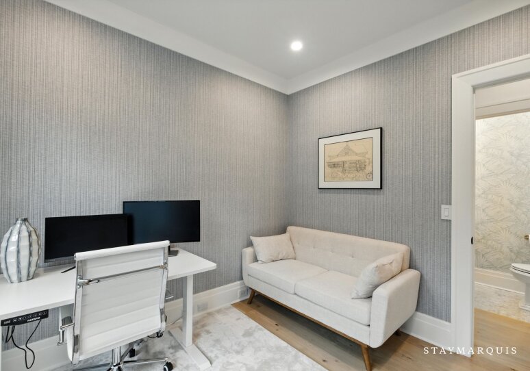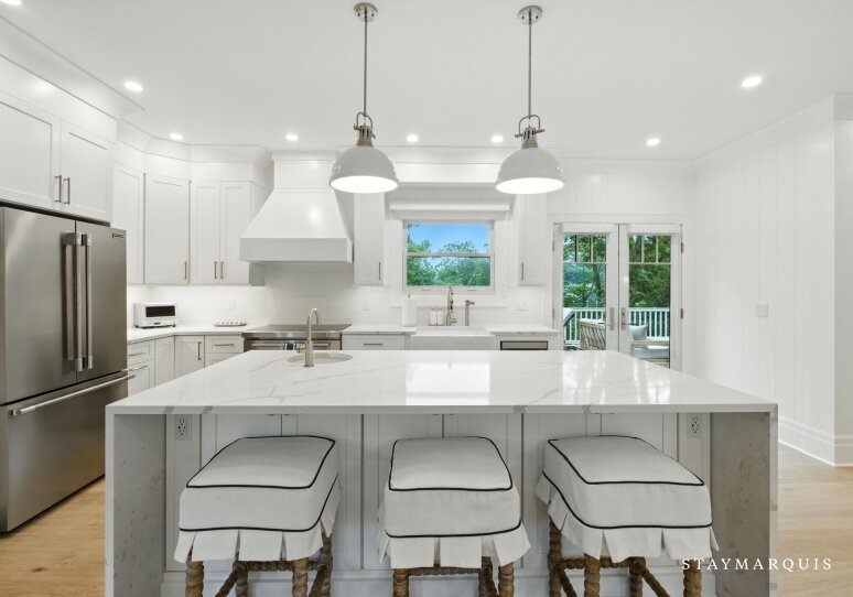 Inside, the experience is equally inspiring. A modern open floor plan allows guests to move effortlessly between the living room, dining area, and chef’s kitchen, all surrounded by oversized windows that draw in natural light throughout the day. The living room’s chic seating invites lounging, conversation, and quiet evenings in, while the dining area sets the scene for memorable meals prepared in the stunning chef’s kitchen. Outfitted with premium appliances, sleek finishes, and a large island perfect for gathering, cooking becomes part of the vacation experience. Glass doors open wide to the deck, creating a true indoor-outdoor lifestyle that transitions seamlessly between breezy mornings and starlit evenings. Every detail is considered—from high-speed WiFi and air conditioning to a washer and dryer, dedicated workspace, and all essentials for a comfortable stay. A stylish main-level den offers a separate place to relax or work, thoughtfully furnished for both productivity and downtime.