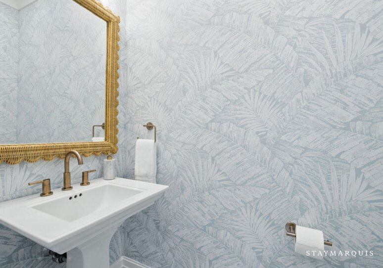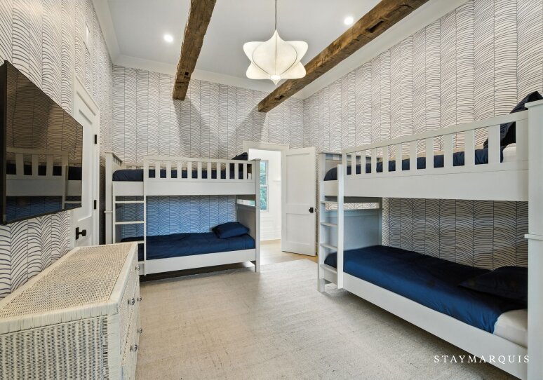 All five bedrooms are located on the second floor, creating a private, restful escape for every guest. The primary suite features a plush queen bed, its own private balcony overlooking the peaceful grounds, and a spacious ensuite bathroom that elevates the everyday routine. Bedrooms two, three, and five each offer elegant queen beds and serene décor, ideal for adults or couples traveling together. The fourth bedroom is designed with two sets of bunk beds, making it a fun and thoughtful space for children or additional guests. Bedrooms three and four share a charming Jack-and-Jill bathroom, while the remaining rooms enjoy their own private ensuites. A stylish powder room on the main level adds extra convenience for daily living and entertaining.
