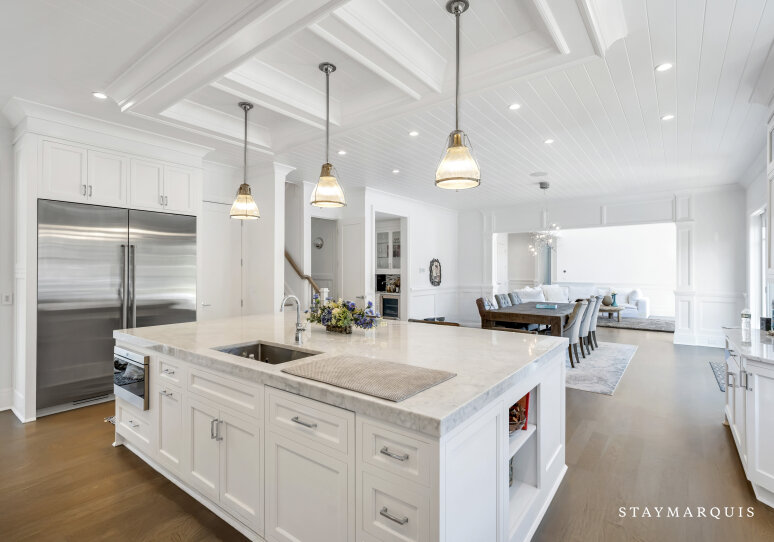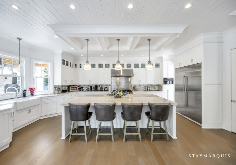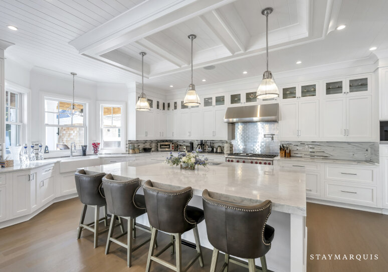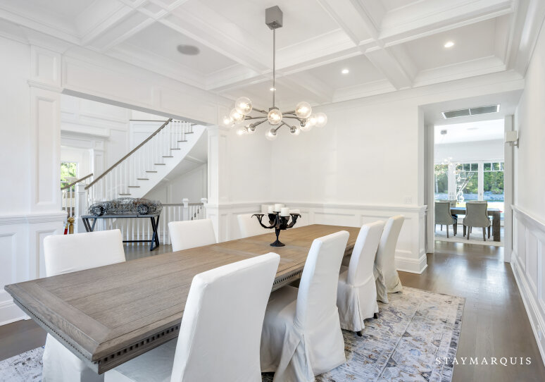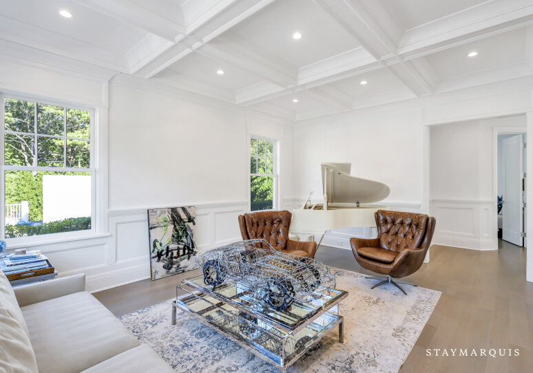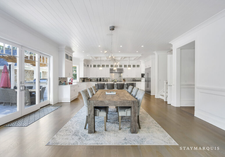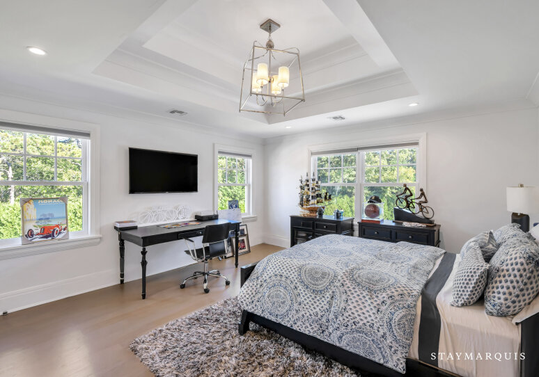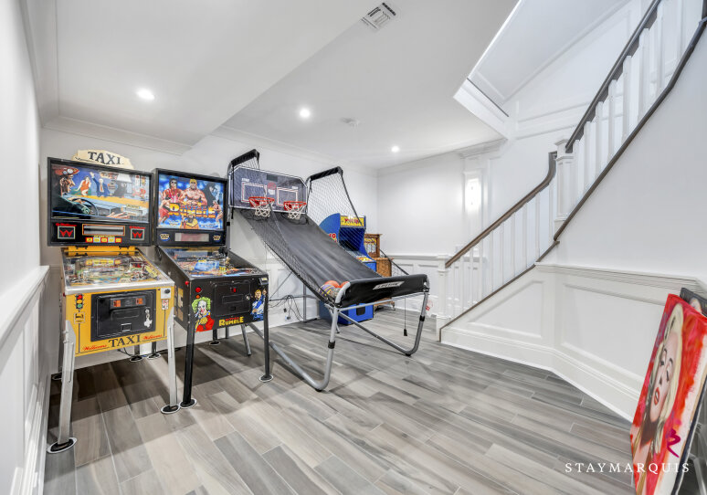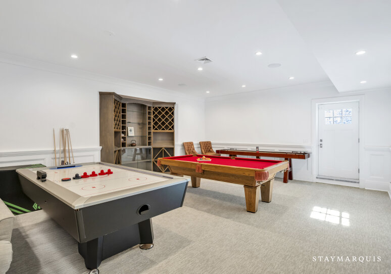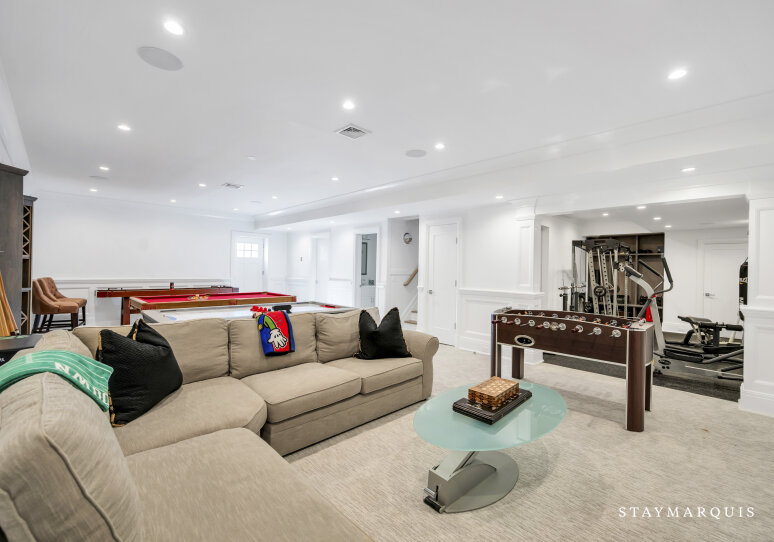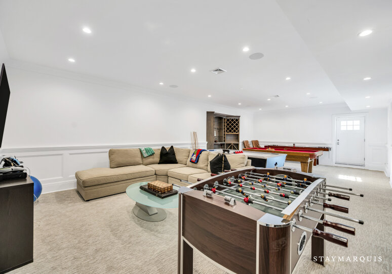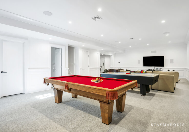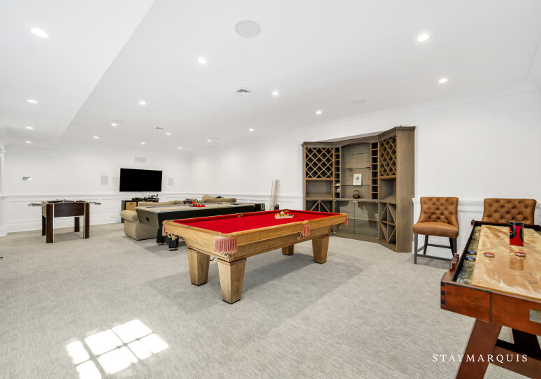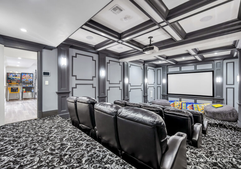 Inside, visitors are greeted by a luminous foyer that flows seamlessly into the principal living areas. The great room, with soaring ceilings and generous windows, feels simultaneously grand and intimately welcoming: picture a warm fireplace, artful furnishings, comfortable seating for conversation, and effortless access to outdoor terraces. Adjacent, the formal dining room is ideal for candlelit dinners or festive family gatherings. The gourmet kitchen is a chef’s delight—high-end appliances and a central island that doubles as a gathering point for morning coffees or evening aperitifs. Beyond lies a casual breakfast nook or banquette area bathed in morning light, perfect for savoring the day’s first moments. The lower level of the home houses a state-of-the-art lower-level theater, complete with a 120" HD screen, 9-channel surround sound, and plush seating—perfect for film nights or streaming your favorite matches. This same lower level includes a full bath and space zoned for a gym or customized use, giving guests the flexibility to tailor to their needs.