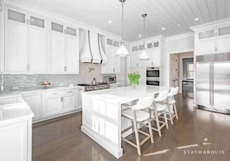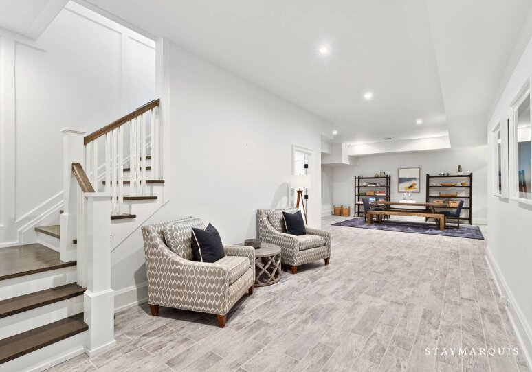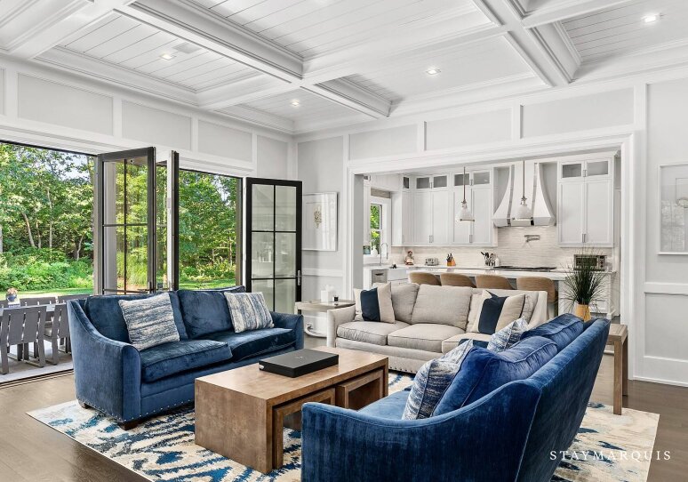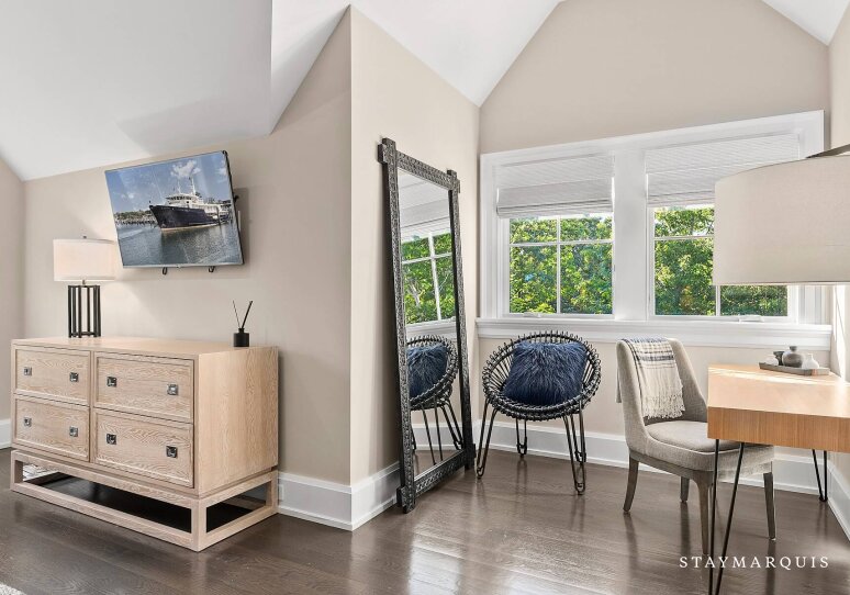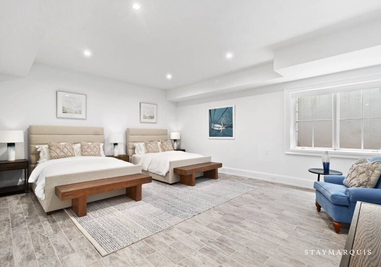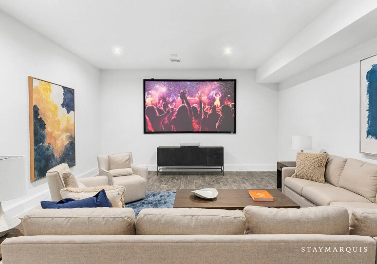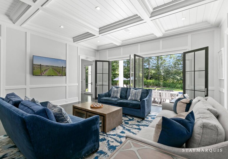 Inside, the home unfolds with a traditional, light-filled floor plan that celebrates both comfort and style. The formal living and dining rooms are designed for entertaining, while an additional main-level den provides a relaxed retreat for casual conversation or movie nights. The chef’s kitchen, complete with high-end appliances, large center island, and all culinary essentials, opens through sliding glass doors to the backyard, inviting fresh air and natural light throughout the day. Each common space is framed by expansive windows and fully retractable glass doors, offering stunning garden views and effortless access to the outdoors. The lower level features a private gym and movie den, while modern amenities like central air, high-speed WiFi, washer and dryer, and a dedicated home office ensure every stay is as practical as it is luxurious.