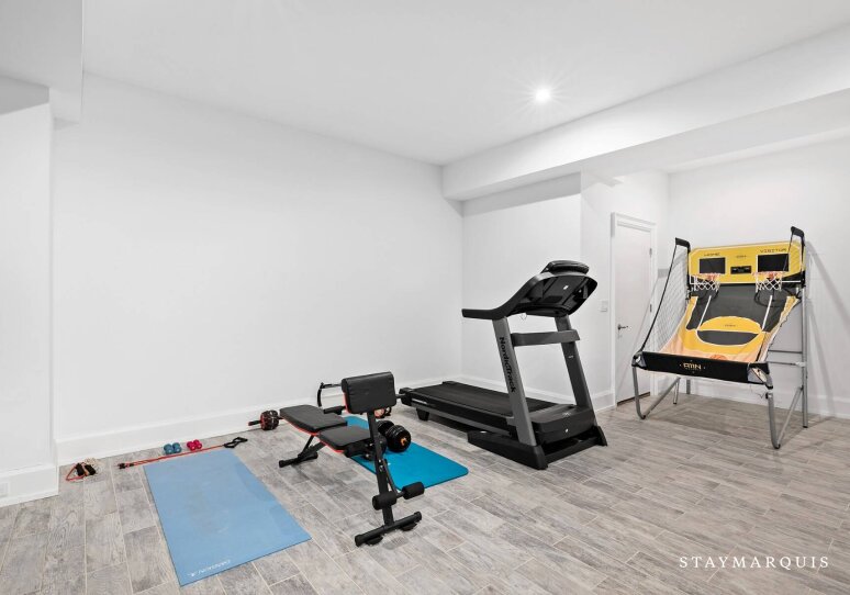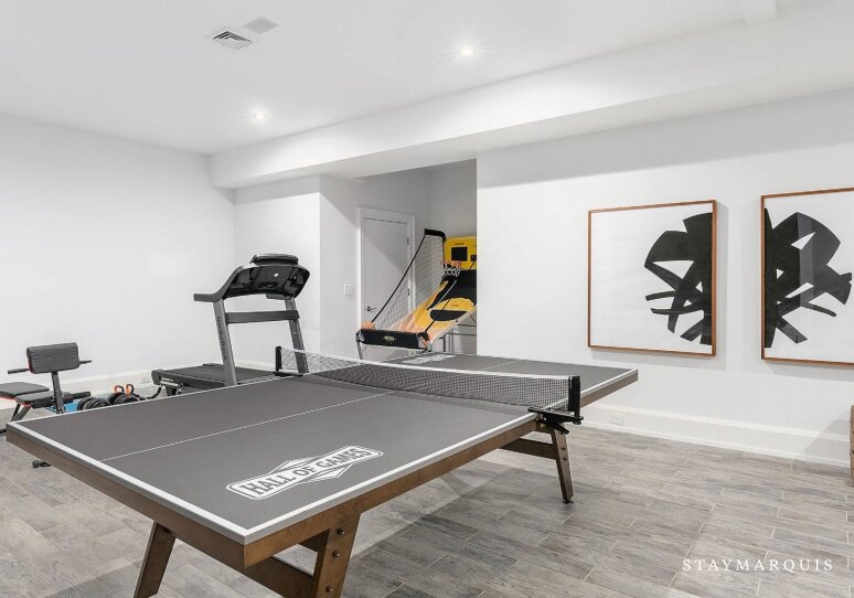 Gym/Fitness Room (Treadmill, Weight Training Equipment), Ping Pong Table, Essentials, Bed Linens, Bath Towels, Pool/Beach Towels, Washer, Dryer, Air Conditioning, Heating, Hot Water, Usable Fireplace, Kitchen, Stove, Oven, Refrigerator, Dishwasher, Living Room, Internet (Wifi), Laptop-Friendly Workspace, Television, Game Room, Ice Maker, Microwave, Dishes and Silverware, Pots and Pans, Private Entrance, Parking, Smoke Detector, Coffee