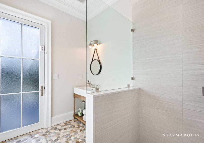 The home’s seven bedrooms provide hotel-level comfort and privacy, each with its own ensuite bath. The primary suite on the second floor is a true sanctuary, featuring a private terrace, fireplace, two walk-in closets, and a luxurious marble bathroom with soaking tub and glass shower. Bedrooms two through five, also on the second level, are elegantly designed with ensuite baths and plush bedding. On the main floor, Bedroom six offers convenience and comfort with its own ensuite—ideal for guests seeking easy access. Bedroom seven, located on the lower level, features an ensuite bath and a quiet, private ambiance. A full bath accessible from both the patio and laundry room is perfect for post-swim refreshes, while a powder room on the main level adds further convenience.
