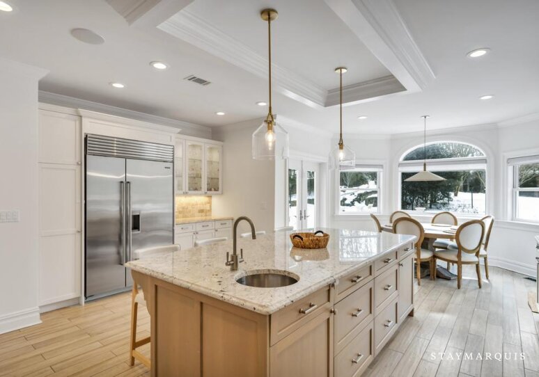 The layout is perfect for entertaining and relaxing. A sun-filled living room and den with fireplace flow seamlessly into the formal dining area and chef’s kitchen featuring Wolf and Sub-Zero appliances and an oversized island. The lower level includes a tiered move theater/move room, gym, and custom golf simulator — ideal for tournament guests or relaxed summer evenings at home. Private community tennis courts are steps away.