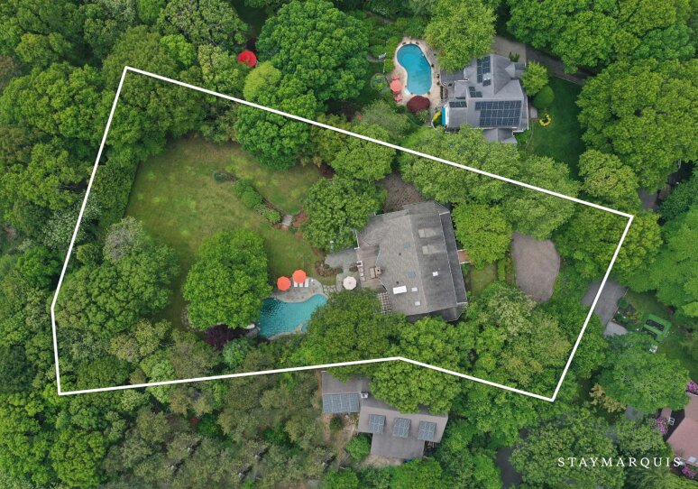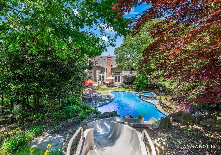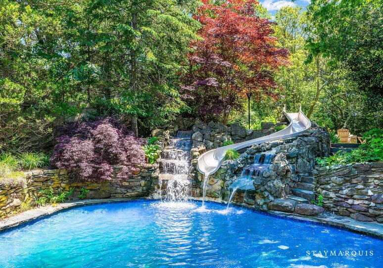 Outdoors, the property delivers a true resort atmosphere. The heated gunite pool with waterfalls and waterslide anchors the private backyard, complemented by a spa, outdoor kitchen with built-in grill and generous seating, fire pit lounge, bluestone patio, pergola, and integrated Sonos sound system. Expansive grounds and mature landscaping create exceptional privacy.