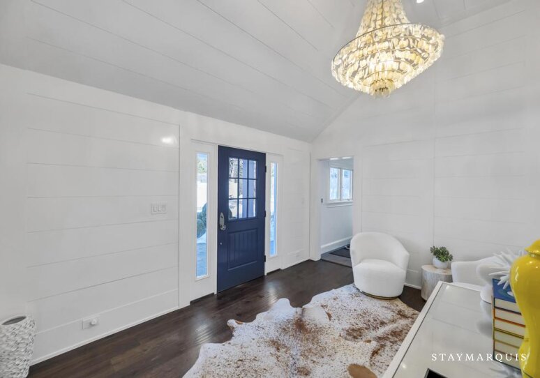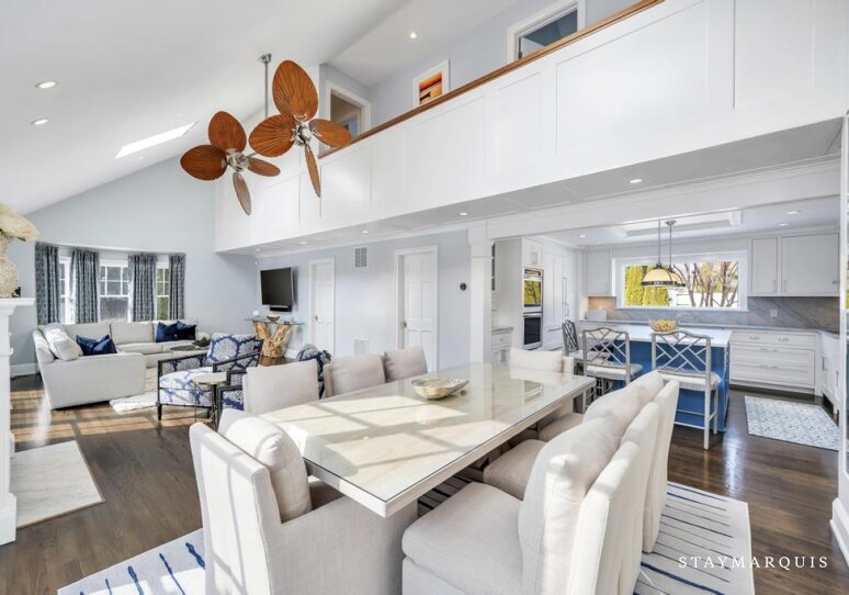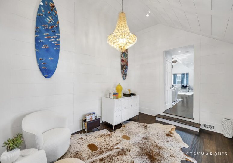 Inside, the home is bright, inviting, and thoughtfully appointed for comfort and convenience. The open layout allows the living room to flow easily into the dining area and kitchen, making it ideal for shared meals, conversations, and relaxed evenings at home. Large windows bring in abundant natural light, enhancing the home’s warm and airy feel. The kitchen is fully equipped with top-of-the-line appliances, generous counter space, and everything needed for anything from casual breakfasts to full family dinners, including a coffee maker for slow mornings at home. High-speed WiFi, central air conditioning, and a washer and dryer ensure a seamless stay, while the Sonos sound system allows guests to set the perfect mood throughout the day. A laptop-friendly workspace offers flexibility for remote work without disrupting the sense of escape.