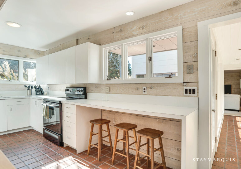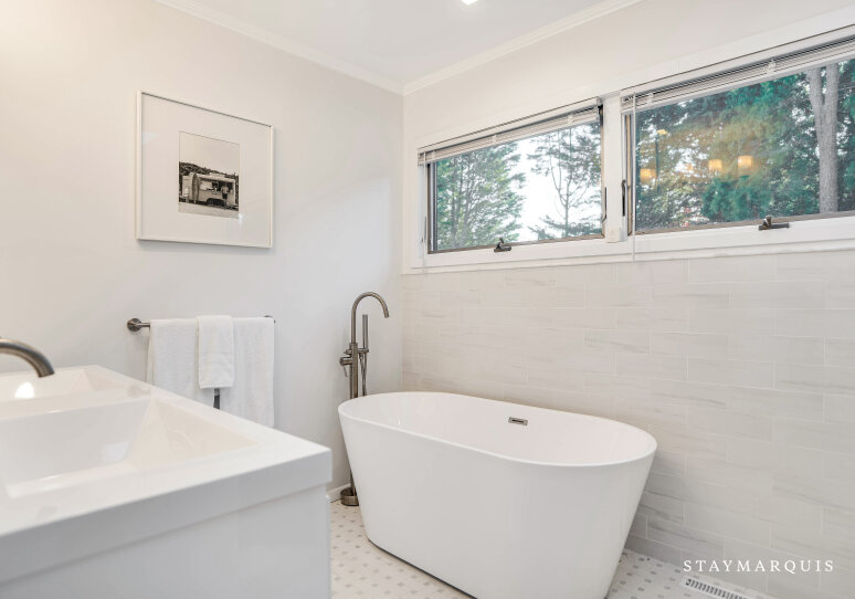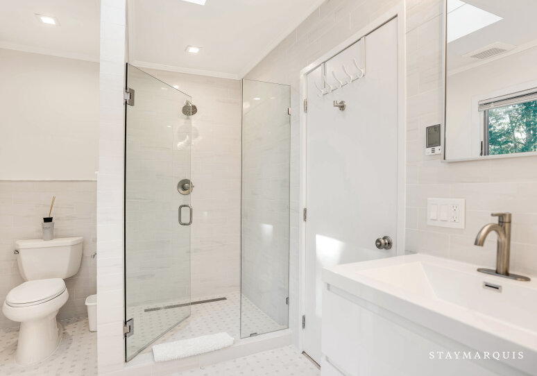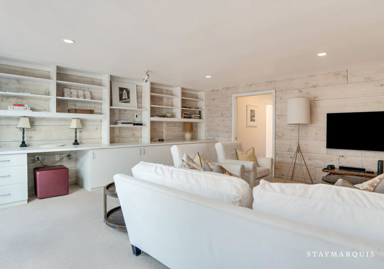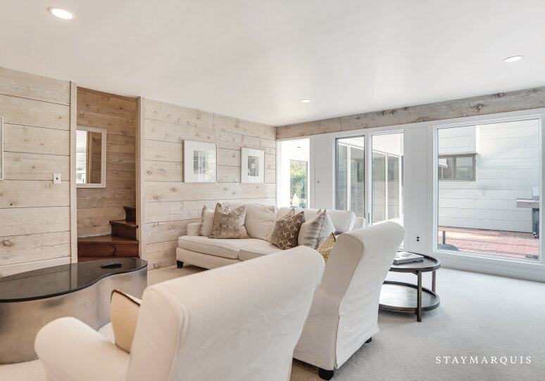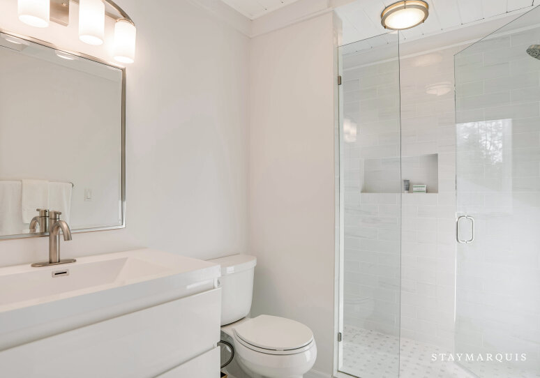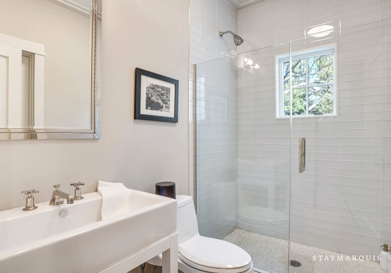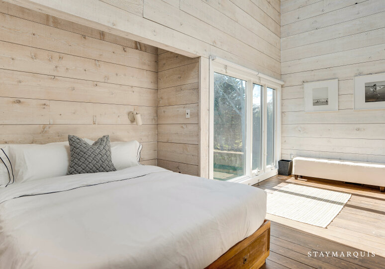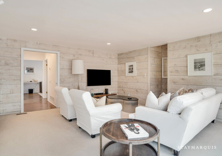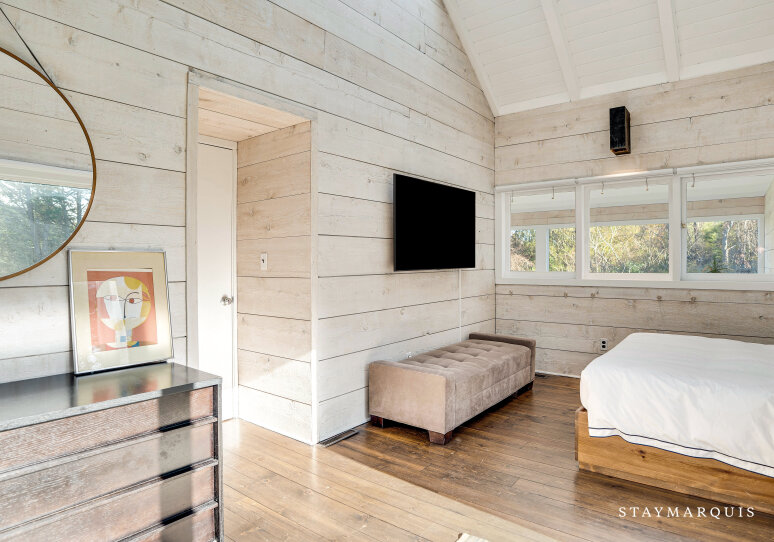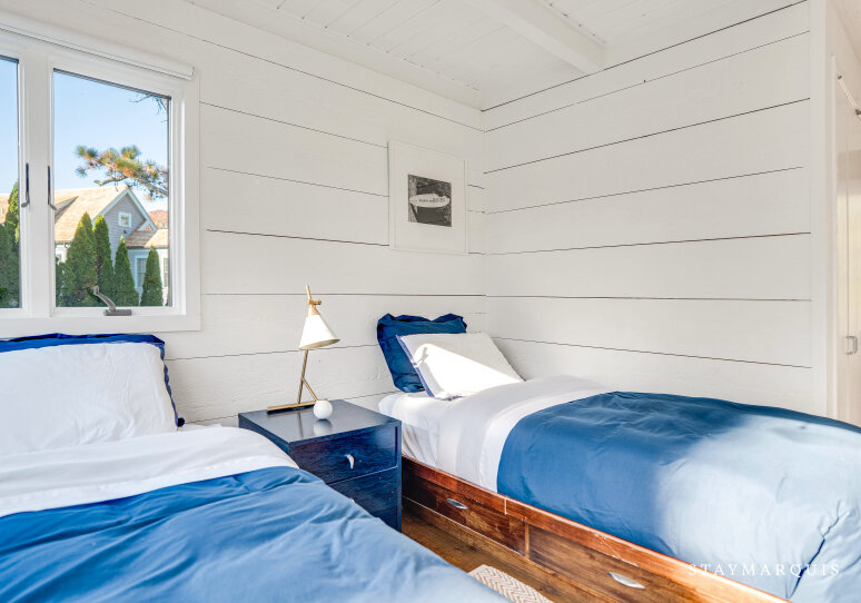 The home’s five bedrooms are calm, inviting retreats that mirror the aesthetic of a boutique coastal inn. Fresh linens, soft textures, and gentle color palettes create a sense of tranquility throughout. Renovated bathrooms, outfitted with clean lines and modern fixtures, provide everything needed for a comfortable and refreshing stay.