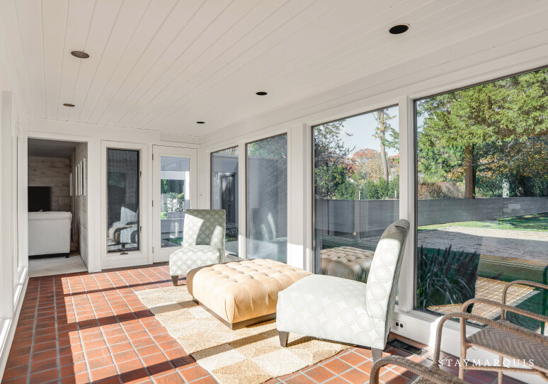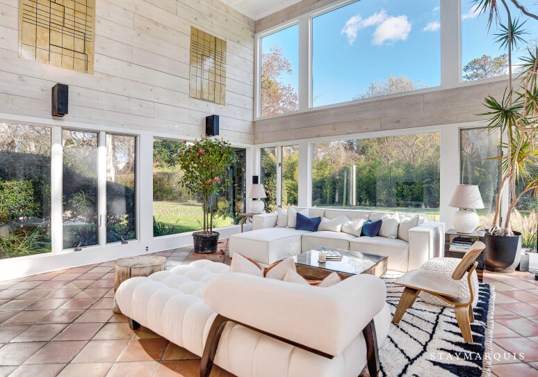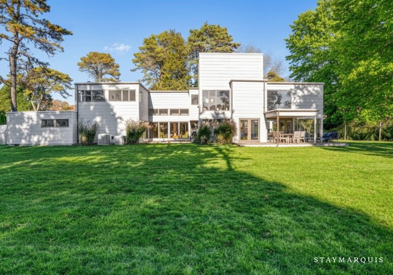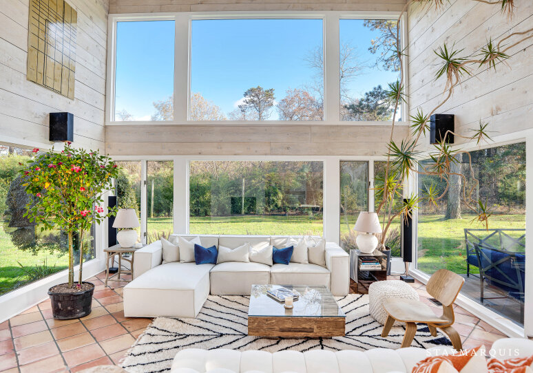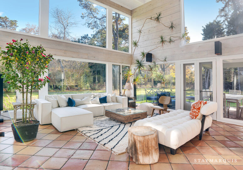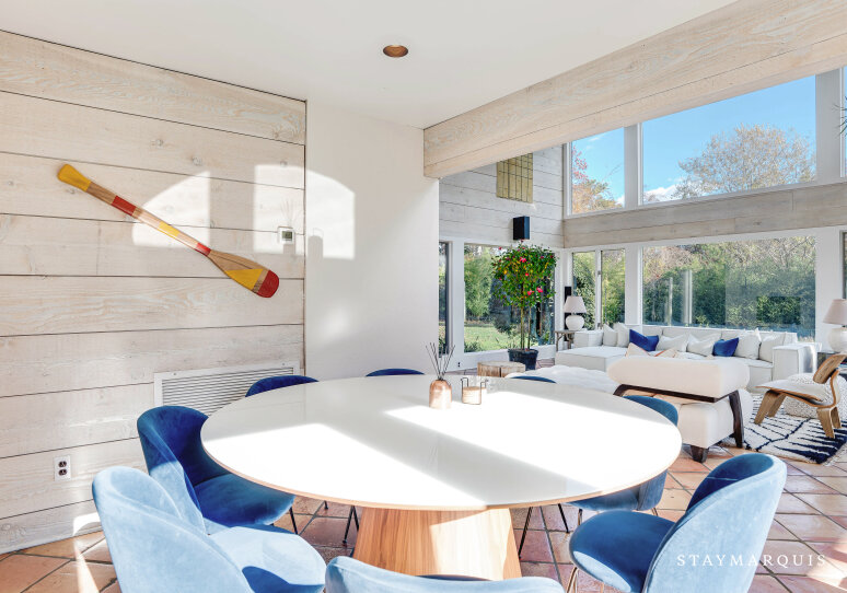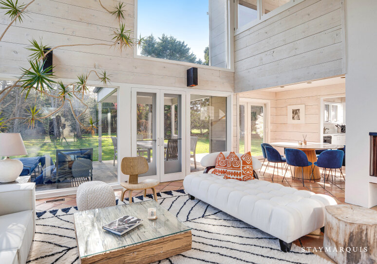 Tucked in East Hampton, this serene Hamptons haven invites guests into a world where simplicity meets elegance and every detail encourages relaxation. Framed by mature landscaping that ensures total privacy, the residence offers a refined coastal escape just moments from Main Beach, Georgica Beach, and the quiet beauty of Georgica Pond. Inside, the home welcomes guests with an impressive double-height living room wrapped in walls of glass, creating an atmosphere filled with natural light and quiet sophistication. A glass-enclosed breezeway leads to a spacious family room—ideal for movie nights or morning coffee—while the open floor plan seamlessly connects each living space. Designed for families or groups seeking a peaceful retreat, this five-bedroom, three-bathroom property comfortably accommodates up to nine guests and offers the perfect setting to step away from daily life on a beautiful, private block.