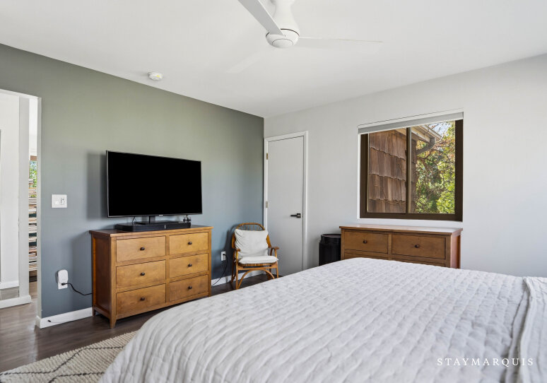 - Primary Bedroom - King: One King Bed, First Floor/Main Floor, Air Conditioning, Full Ensuite Bathroom, Streaming TV, Standard Closet