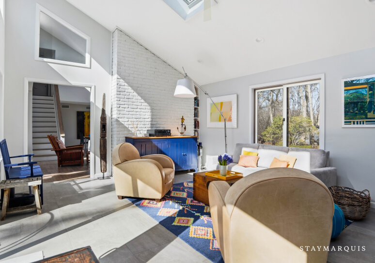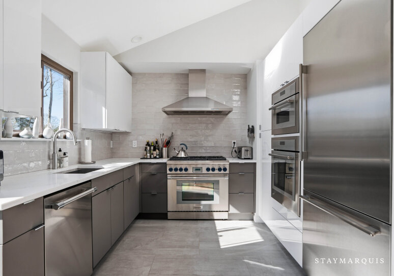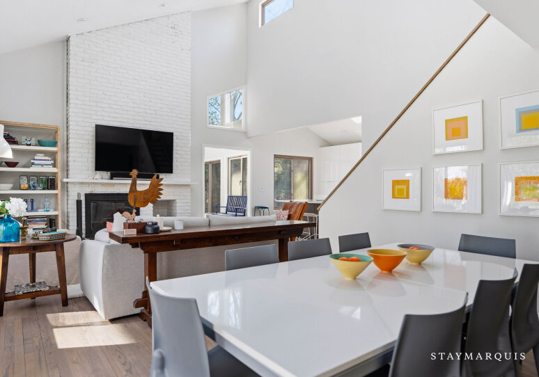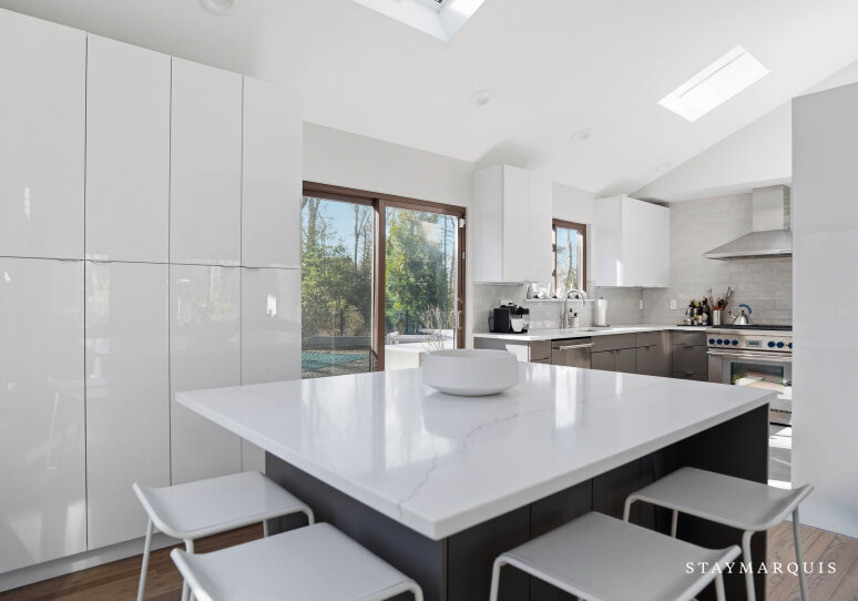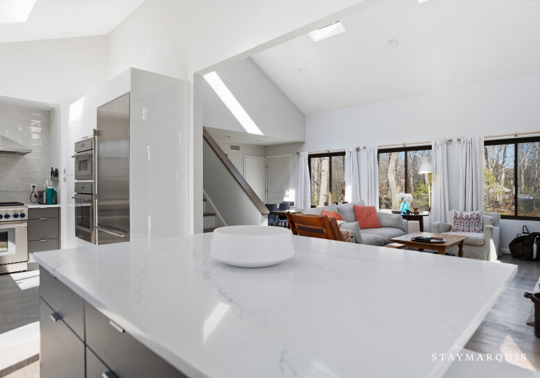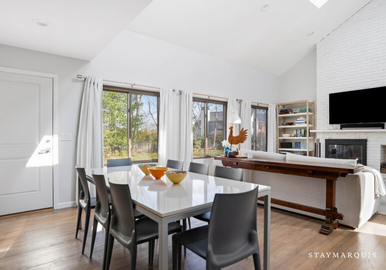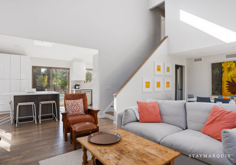 Inside, natural light fills the home through expansive windows, highlighting interiors that blend coastal charm with modern comfort. The living, dining, and kitchen areas flow seamlessly together, creating a space that feels both functional and inviting. The kitchen is fully equipped with high-end appliances and generous counter space, while a Sonos sound system, high-speed WiFi, central air, and in-home laundry ensure a seamless stay.