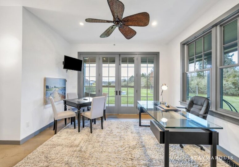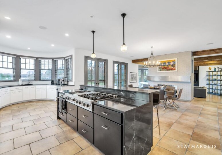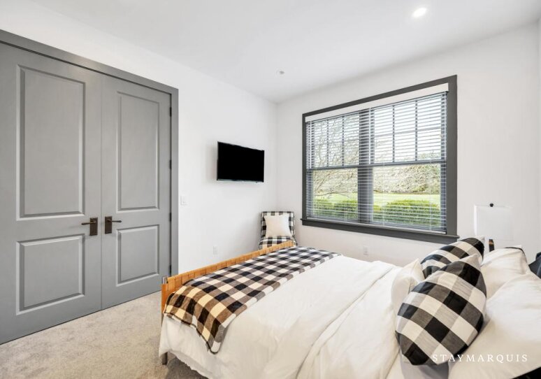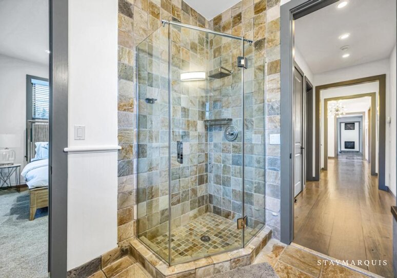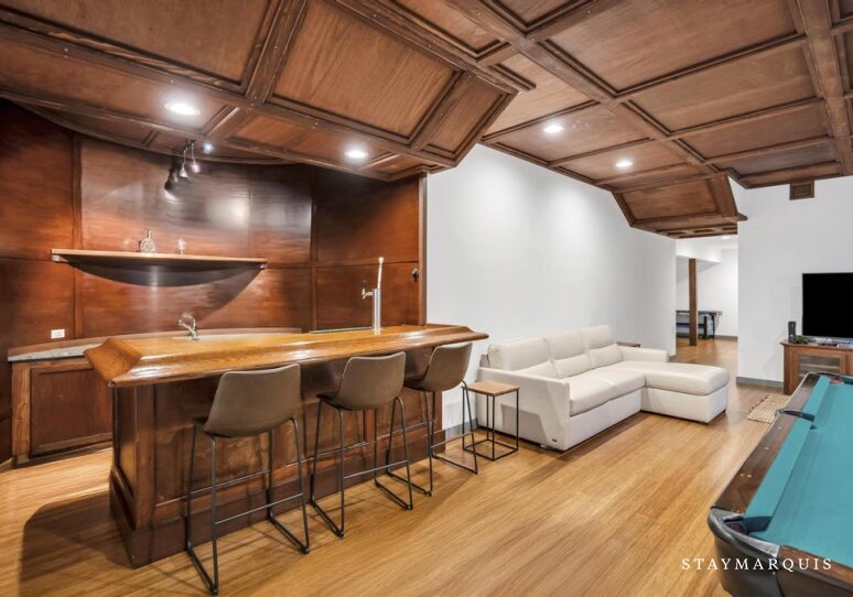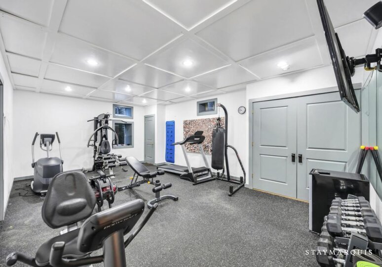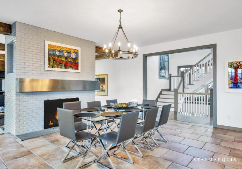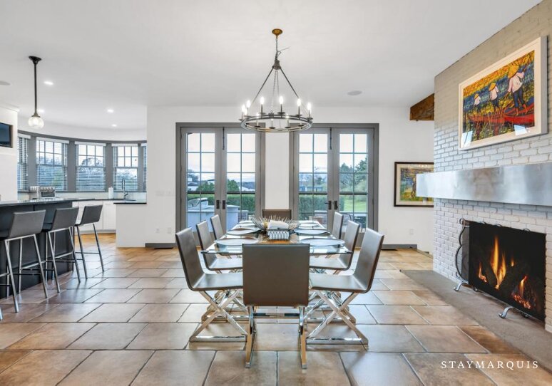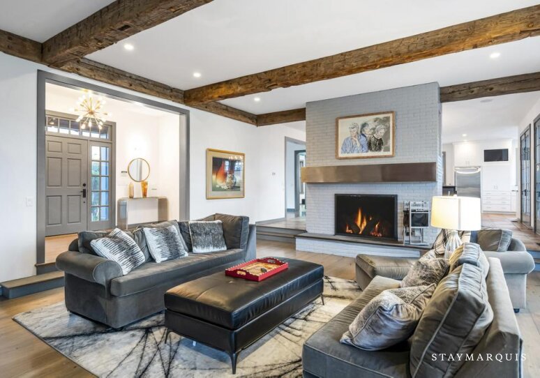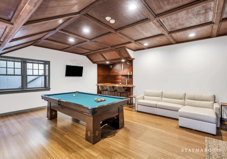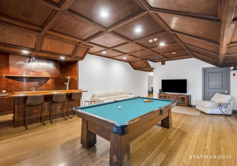 Inside, the home’s interior flows effortlessly with an open-concept design that connects the living room, dining area, and chef’s kitchen. Bright and airy, with abundant windows and glass doors that open to the back deck, the space perfectly balances indoor and outdoor living. The professional chef’s kitchen is outfitted with premium appliances, a large island, and all essentials for effortless cooking and entertaining. Comfortable living areas, a double-sided fireplace, and a sunken living room create inviting spaces for gathering, while a finished lower level features a mahogany bar, pool table, wine cellar, and a professional-style gym. Modern comforts, including central air, high-speed Wi-Fi, a private office, and in-unit laundry, ensure a stay that’s as convenient as it is luxurious.
