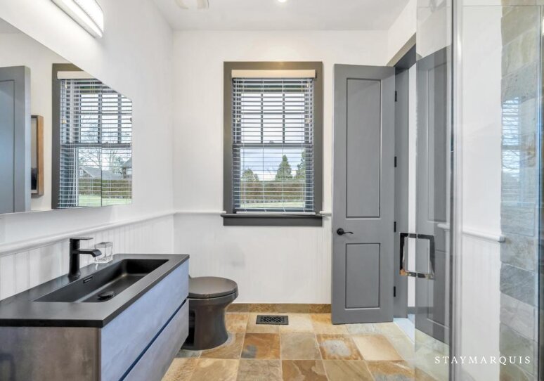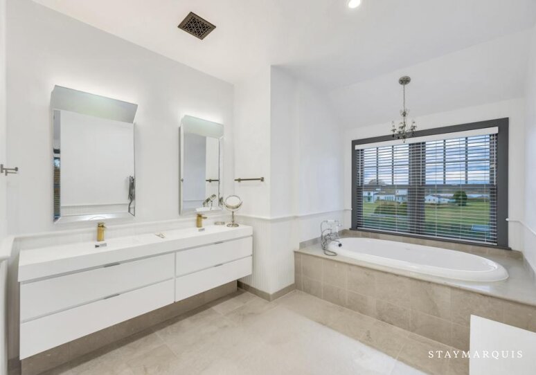 The estate’s six bedrooms and six-and-a-half bathrooms are designed for comfort and privacy. All second-floor bedrooms feature ensuite bathrooms, including the primary suite with a king bed and indulgent bath. Bedrooms three and five offer queen beds with private baths, while bedroom six is outfitted with two bunk beds and an ensuite. On the main level, bedroom one has a double bed, and bedroom two provides a queen bed with an ensuite, complemented by a powder room for guests. An additional full bathroom on the lower level ensures ample accommodation for all. Each bedroom combines chic, curated décor with serene views of the grounds, offering restful retreats after days in the sun.
