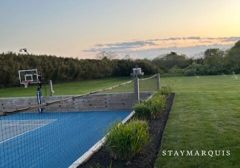 Outside, the estate’s backyard is an entertainer’s dream. Spend your days soaking in the sun on the pool’s expansive sundeck, take a refreshing dip in the private heated pool, or unwind in the hot tub under the open sky. The tennis/pickleball court, equipped with basketball hoops, provides hours of active fun, while the lush green spaces and fenced yard offer safe play for children or quiet strolls through the private garden. Gather around the fire pit as the sun sets or host a lavish outdoor meal in the fully equipped kitchen with a gas grill and ample dining space. With multiple outdoor seating areas, total privacy, and plenty of free parking, this home delivers the ultimate resort-like experience just steps from the Hamptons’ world-class beaches.