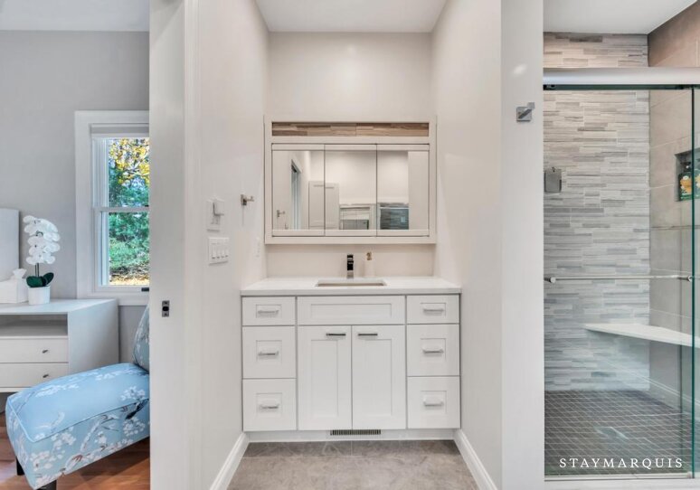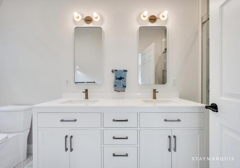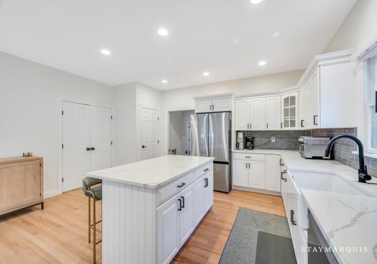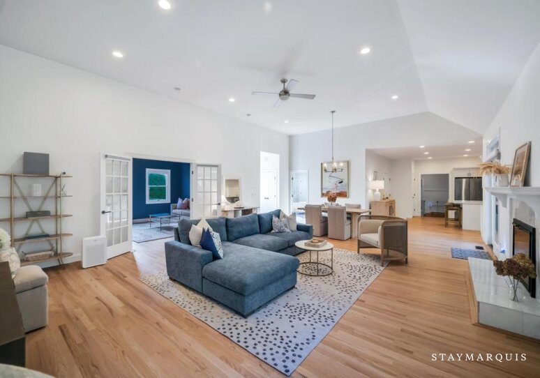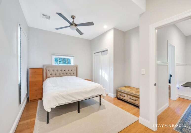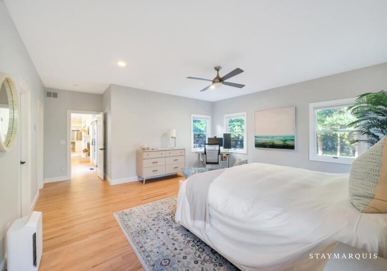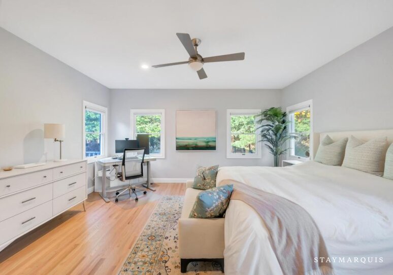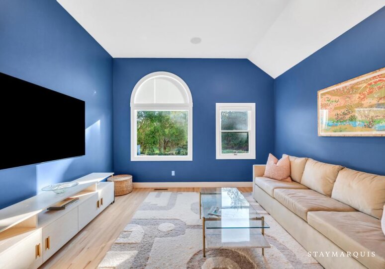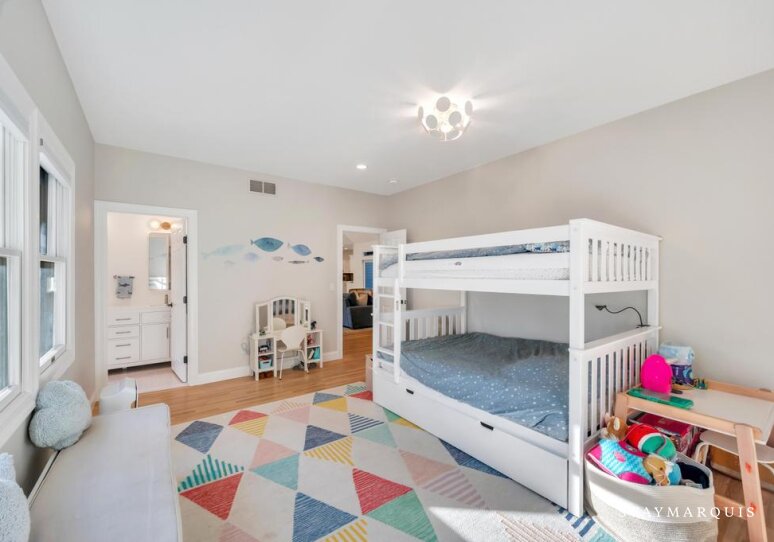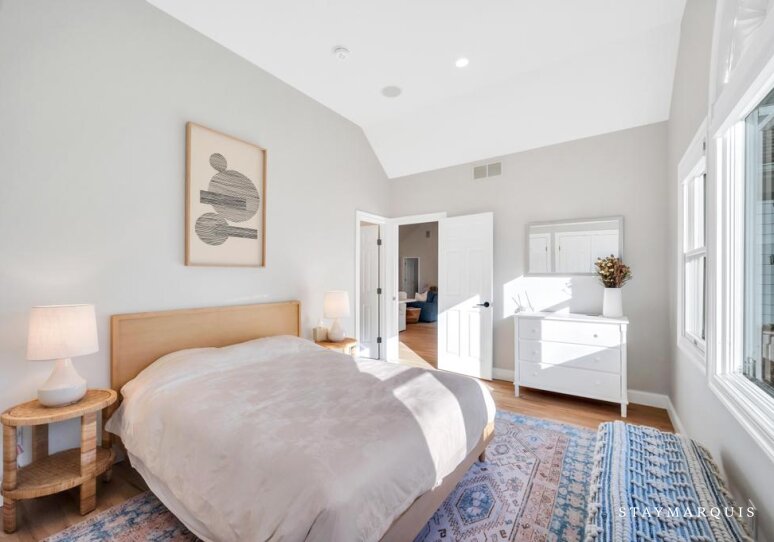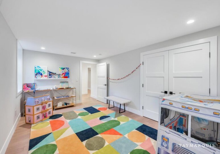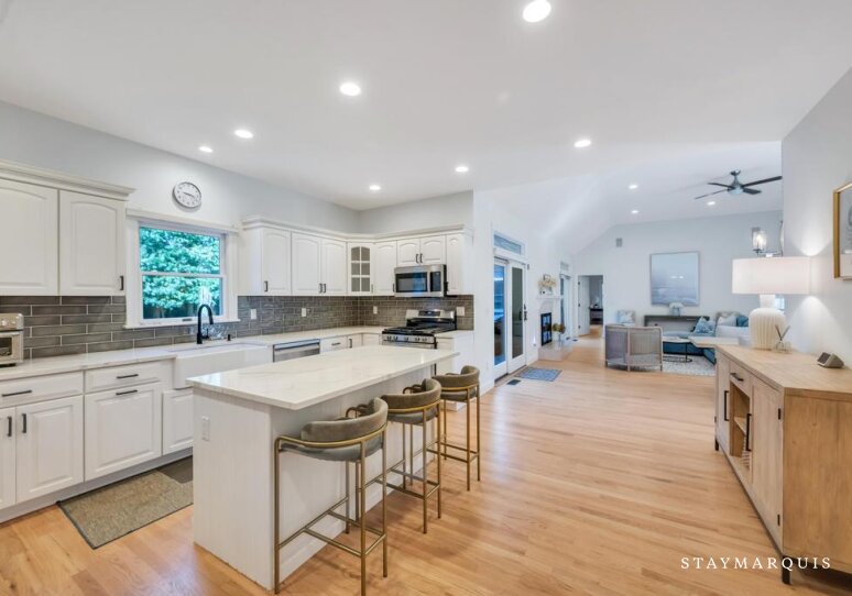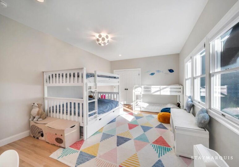 The five bedrooms and five bathrooms are warm, comfortable, and thoughtfully appointed. One of the bathrooms has a curbless shower for multi-generational needs. The primary suite features a king-sized bed, ensuite bathroom, a desk, and space for quiet reflection, while other rooms include queen beds, bunk beds perfect for children, and additional king accommodations, all with fresh linens and all the essentials you could need for a worry-free stay. Each room exudes understated elegance, with cozy touches and practical comforts that make every guest feel at home.