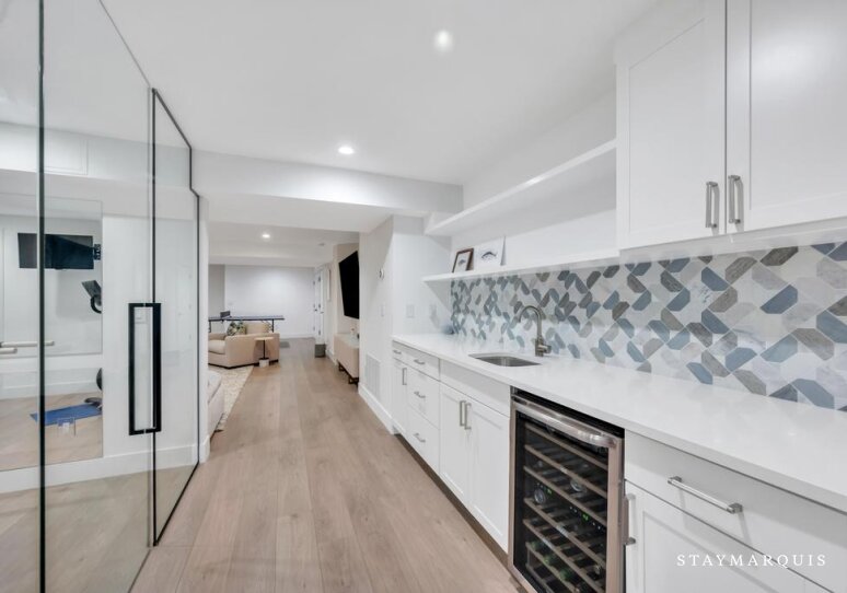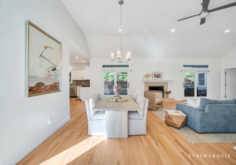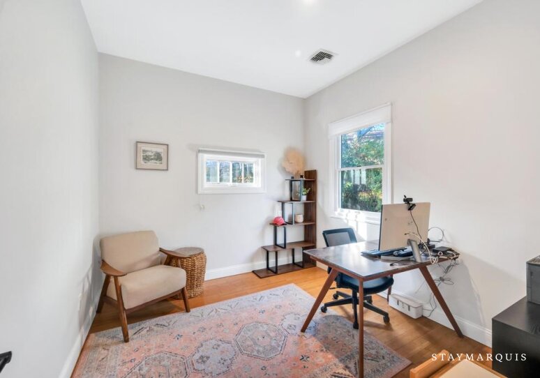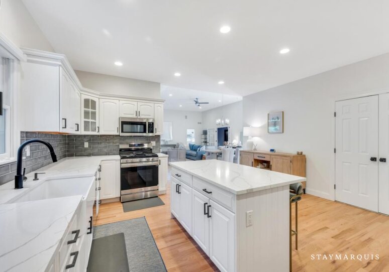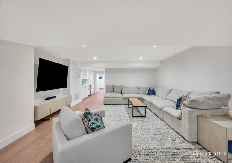 Inside, the home welcomes guests with an easy flow from room to room, emphasizing natural light and the airy, open feel of the living areas. The great room and adjacent dining space are ideal for leisurely mornings or evening meals, while the kitchen, complete with all new, high-quality appliances and thoughtful touches like a coffee maker, invites shared cooking and casual entertaining. A cozy media area and gym provide additional spaces to relax, play, or recharge, while a dedicated office ensures quiet moments for work or correspondence. Every space has been designed to create a seamless, comfortable experience, where functionality meets a classic, inviting aesthetic.