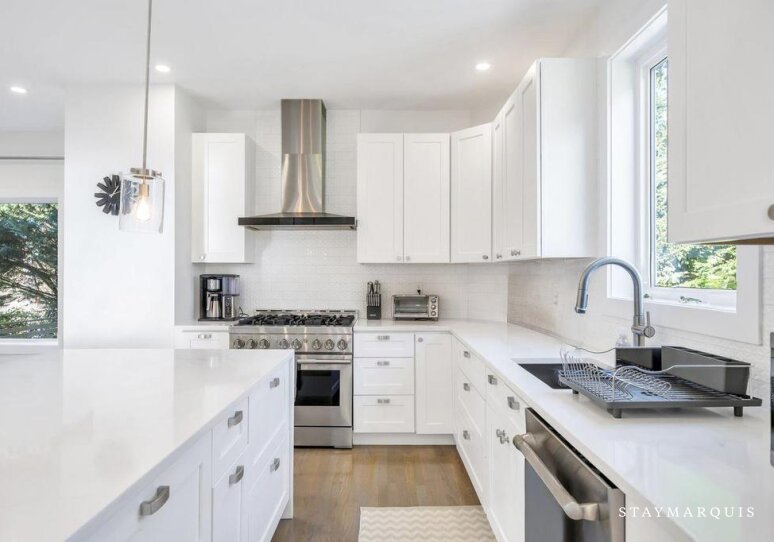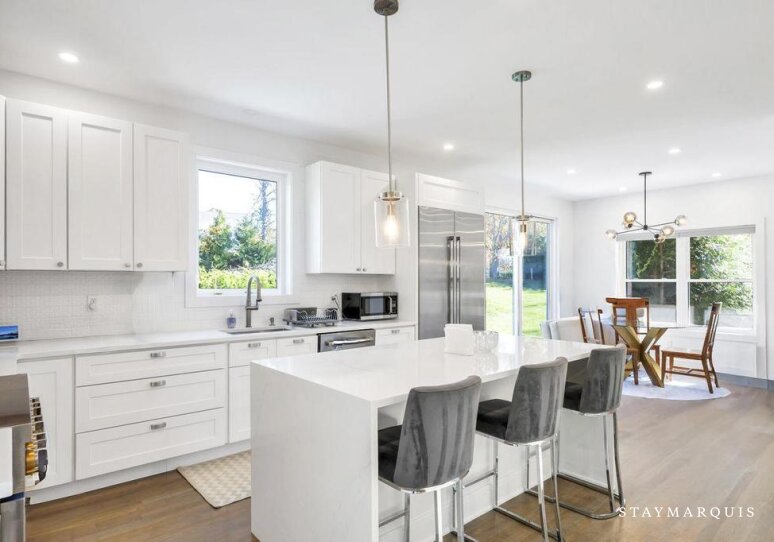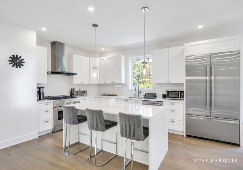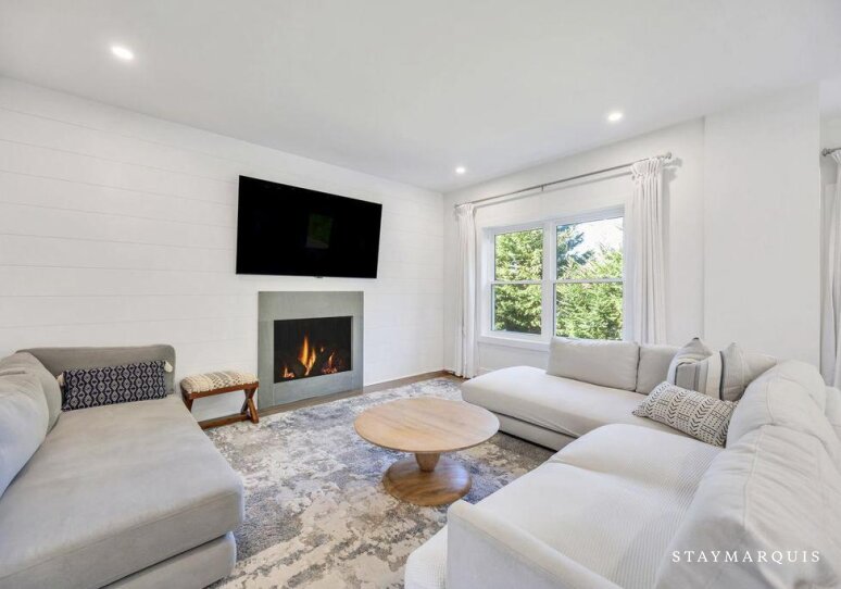 Inside, the home continues to impress with an open, light-filled design that immediately feels inviting. The main level’s thoughtful layout creates an effortless flow between the living room, dining area, and chef’s kitchen. Expansive windows frame serene views of the lush grounds, while large glass doors open directly to the back deck, blending the indoors with the outdoors. The main living room, furnished with a plush sectional sofa, TV, and fireplace, offers the perfect spot for cozy evenings after a day at the beach. The kitchen is a culinary dream, featuring modern appliances and fully stocked with cookware, dishes, and essentials—ideal for anything from quick breakfasts to elaborate dinners.
