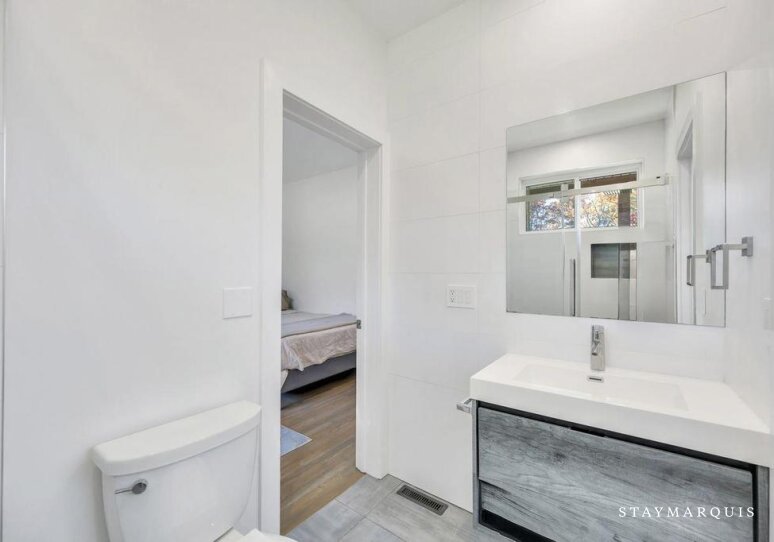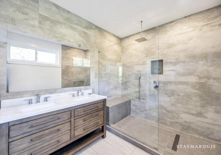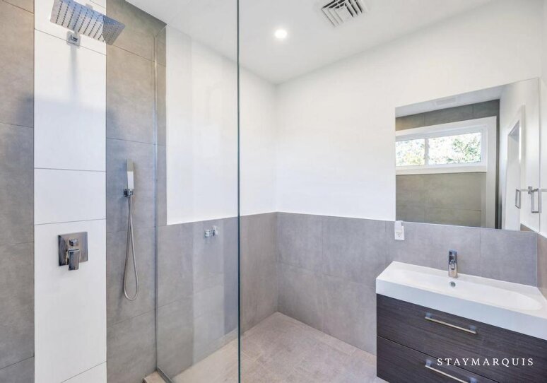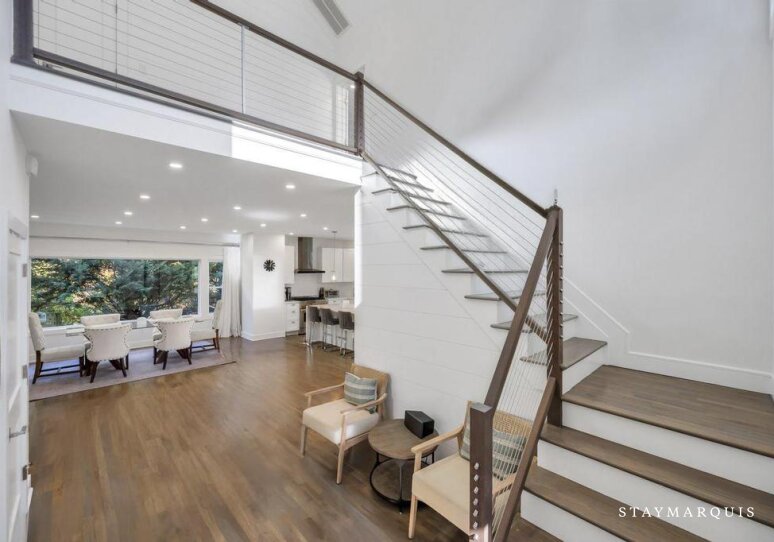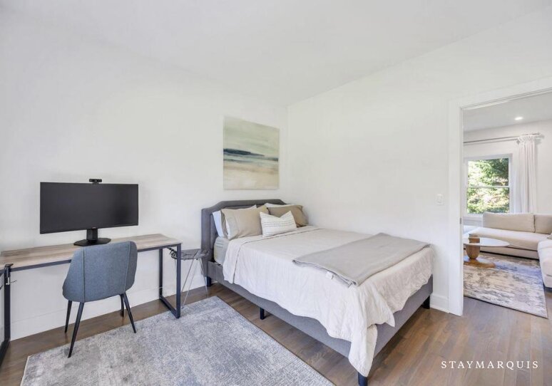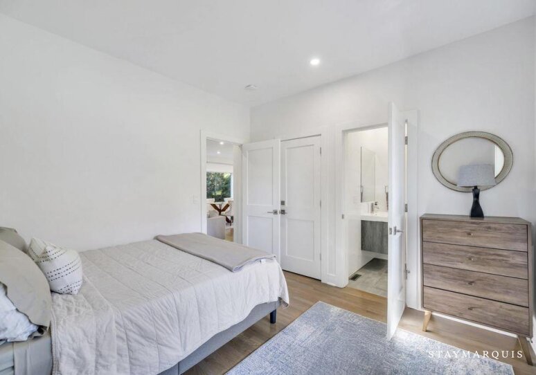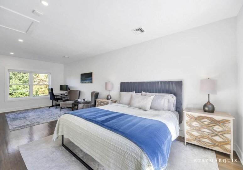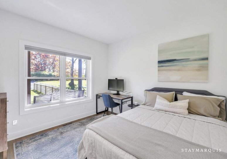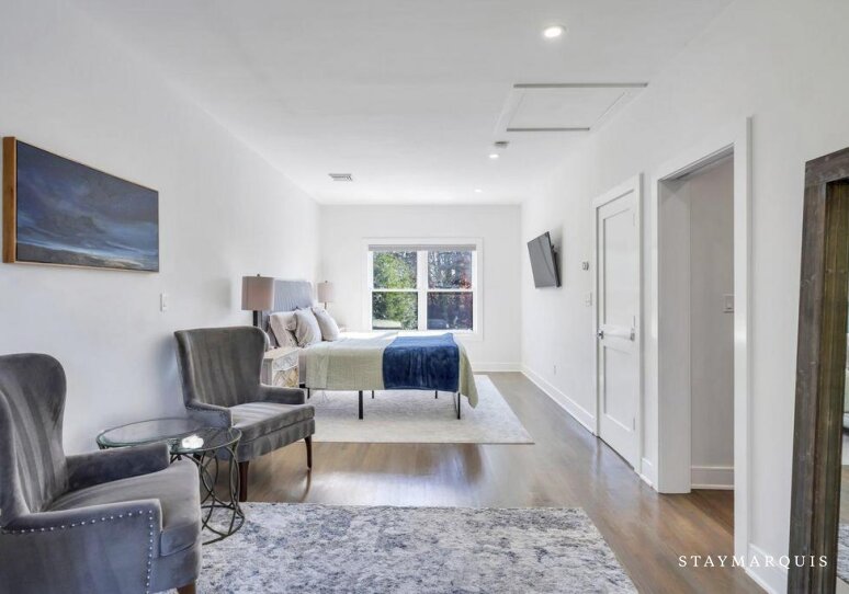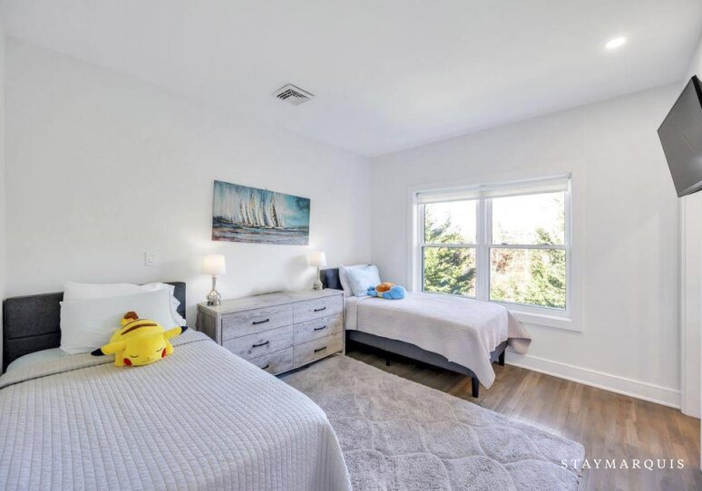 The bedrooms are designed as serene retreats, each thoughtfully furnished to encourage rest and relaxation. On the second level, the spacious primary suite offers a king bed, a comfortable desk area, and cozy reading chairs. Its ensuite bathroom feels spa-like, featuring a large walk-in rain shower that makes every morning feel indulgent. Two additional guest bedrooms are also located upstairs—one with a full bed, the other with two twin beds—each boasting its own ensuite bathroom, making this home ideal for groups traveling together who value privacy. On the main level, another king bedroom with an ensuite bathroom offers ease of access and a calming, light-filled space. An additional powder room on the lower level adds convenience for guests. Each bedroom is dressed with fresh linens, curated furnishings, and a calming palette that makes unwinding effortless.