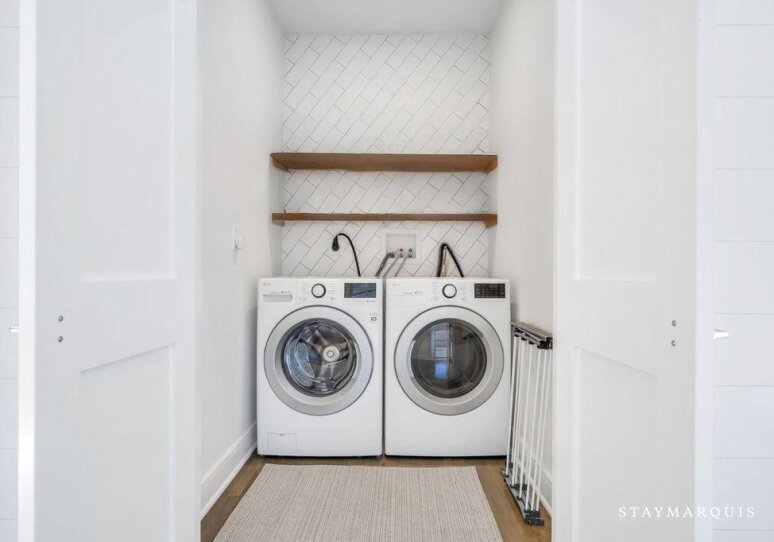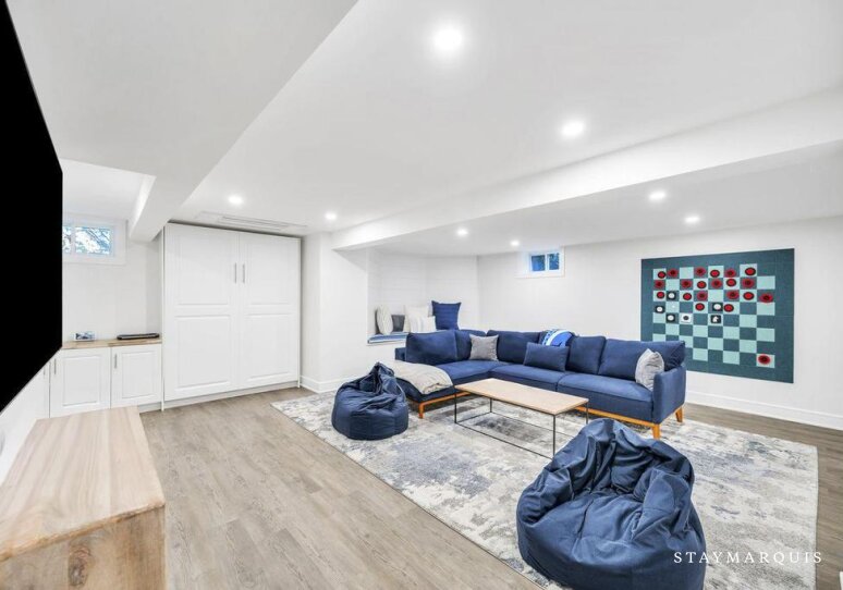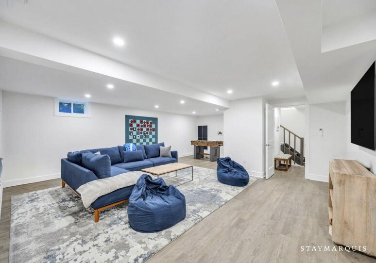 For entertainment and extra space, the finished lower level provides a second living area complete with a sectional sofa, foosball table, and a Murphy bed, offering flexibility for larger groups. Whether hosting family movie nights, enjoying a spirited game of foosball, or creating a quiet nook for remote work, this level adds to the home’s versatility. Modern conveniences, including high-speed WiFi, central air conditioning, laundry facilities, and a dedicated workspace, ensure guests can enjoy a seamless stay with every comfort of home.