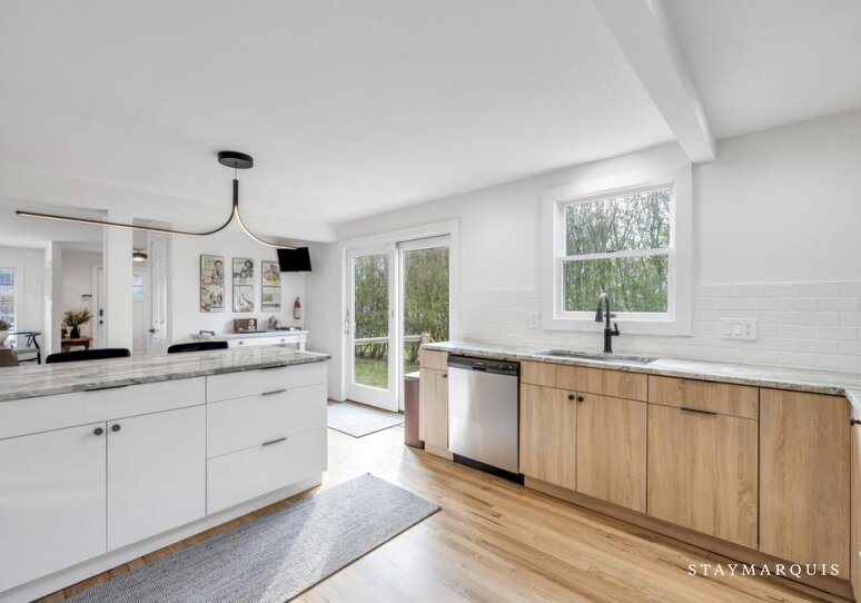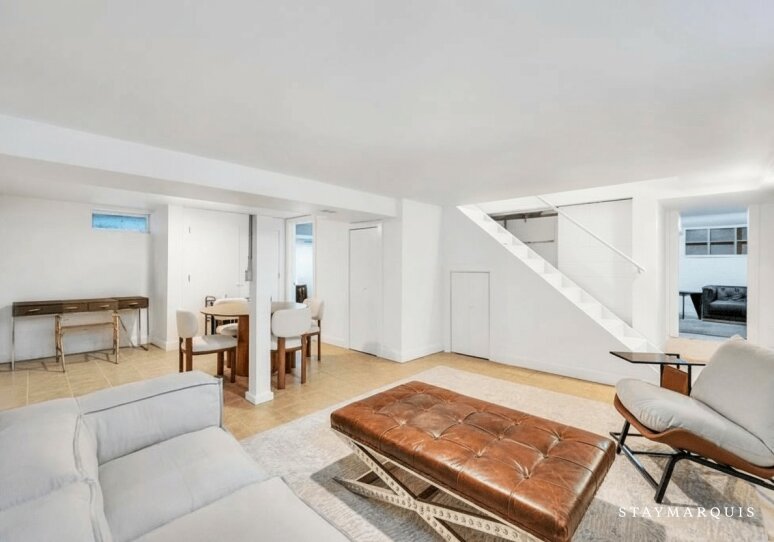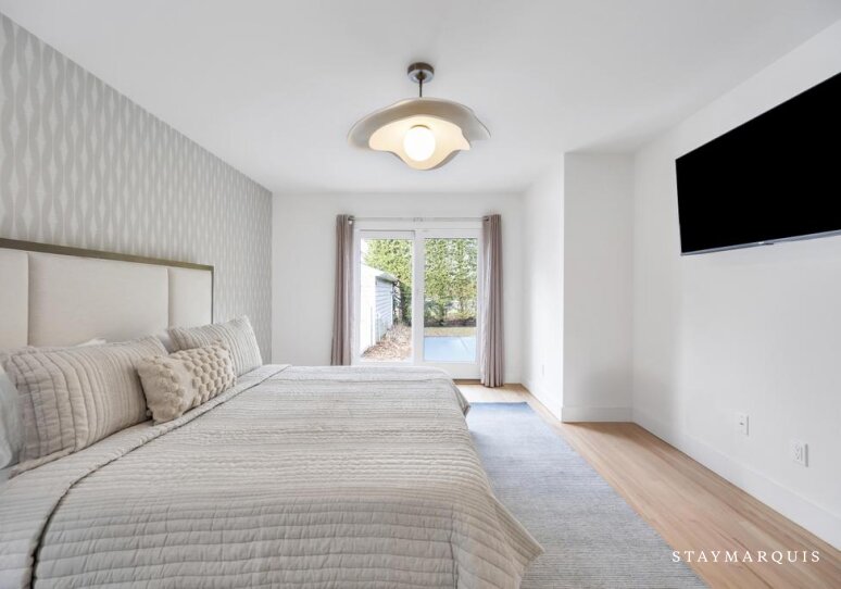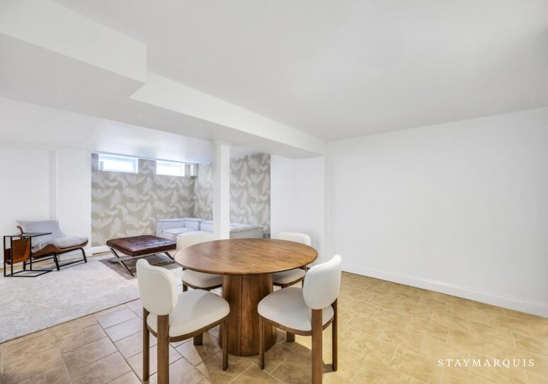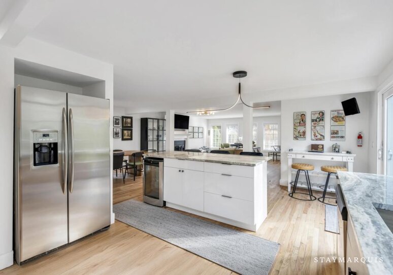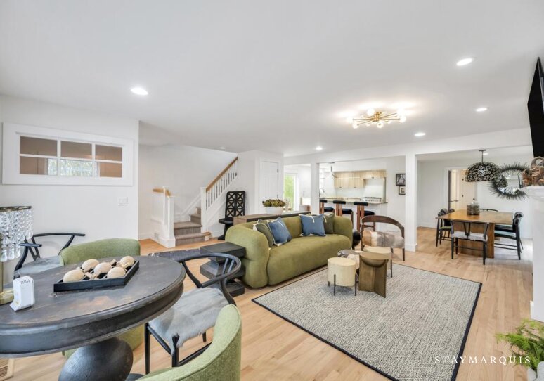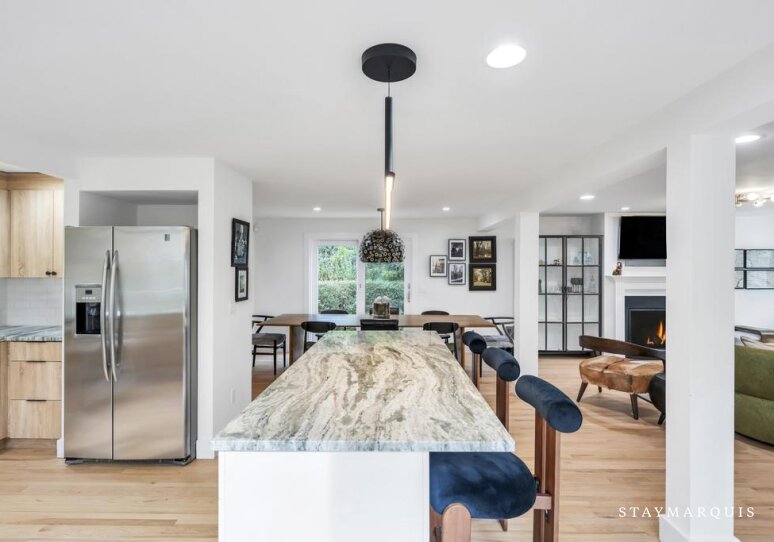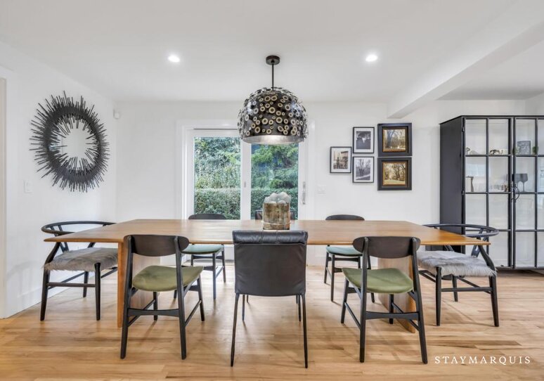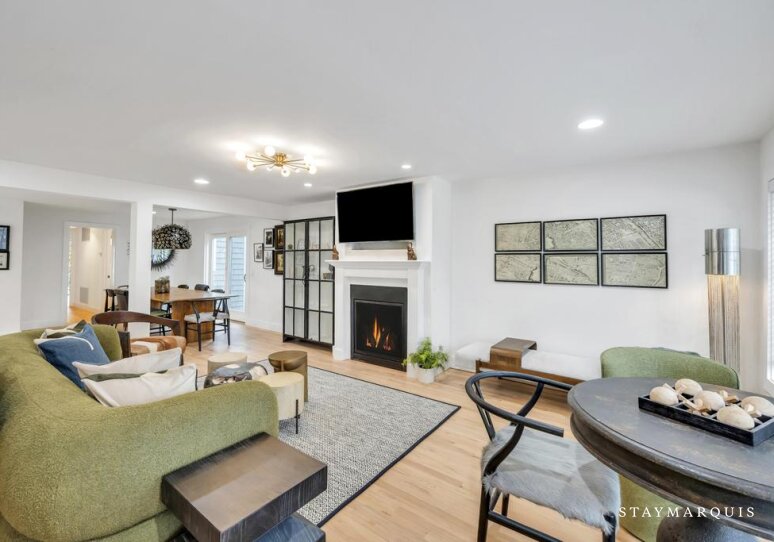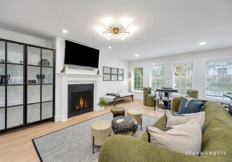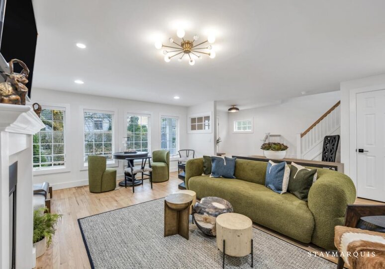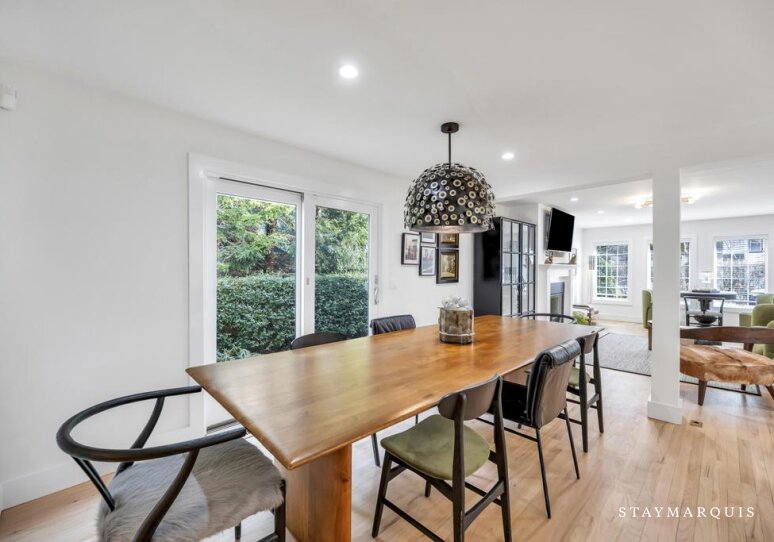 Inside, the home welcomes guests with a light-filled, open layout that flows seamlessly from room to room. The main living spaces are airy and comfortable, with generous seating areas perfect for gathering, relaxing, or entertaining. Large windows allow natural light to pour in throughout the day, enhancing the home’s warm and welcoming feel. The living room opens naturally to the dining area and gourmet kitchen, making it easy to stay connected whether preparing meals or enjoying them together. The kitchen is well-appointed with top-of-the-line appliances, ample counter space, and a coffee maker ready for slow mornings at home. Modern conveniences such as WiFi, central air conditioning, and a washer and dryer ensure a comfortable, carefree stay, while a laptop-friendly workspace allows guests to work remotely when needed. Not to mention a gym in the garage so you never miss a workout.