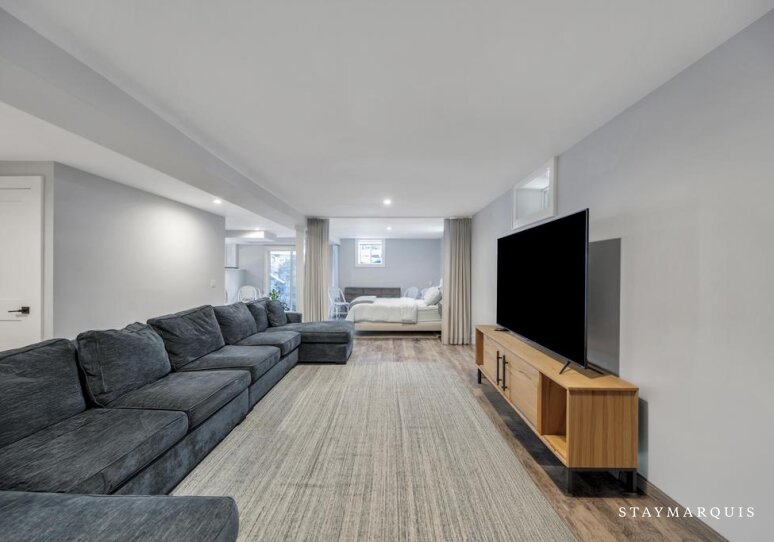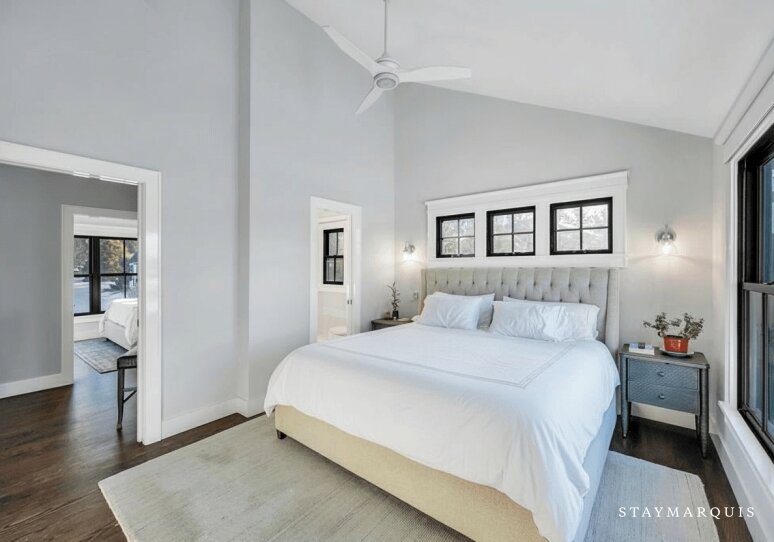 Inside, the home’s open layout is ideal for both entertaining and quiet moments. The living spaces flow naturally from the living room to the dining area and into a fully equipped, modern kitchen featuring top-of-the-line appliances and a coffee maker for leisurely mornings. Large windows flood the interior with natural light, highlighting the contemporary finishes and thoughtfully arranged furnishings. Central air conditioning keeps the home comfortable year-round, and high-speed WiFi allows guests to stay connected or work remotely if desired. A washer and dryer provide added convenience, making longer stays easy and enjoyable.