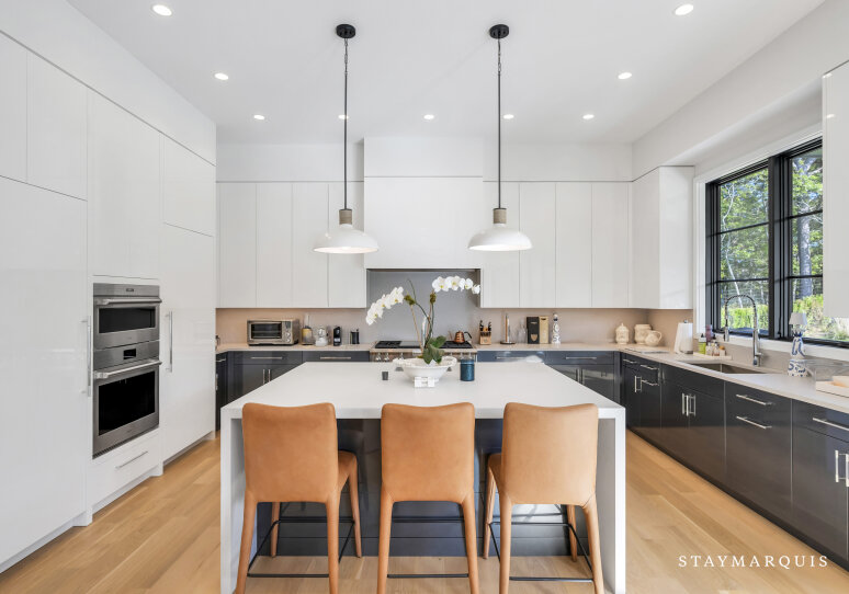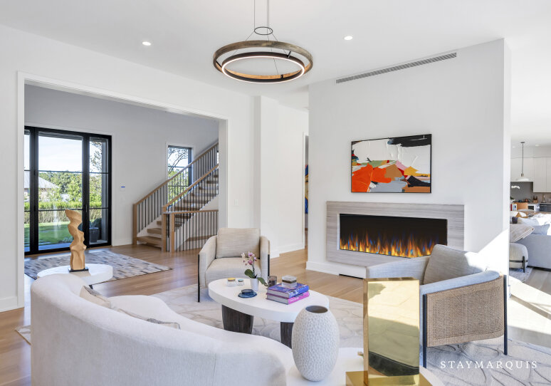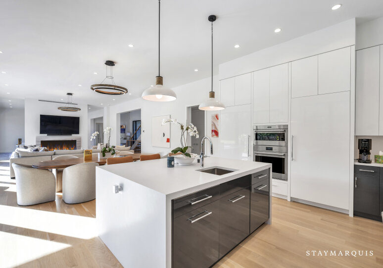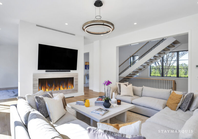 Inside, the estate continues to impress. Open floor plans create a natural flow between the living, dining, and kitchen areas, with large glass doors that seamlessly extend the indoor spaces into the backyard. The main-level living room is anchored by a plush U-shaped sofa and a striking double-sided gas fireplace, ideal for lounging or entertaining. The chef’s kitchen is outfitted with top-of-the-line appliances, a large island, and all the essentials to host intimate dinners or festive gatherings. Every space is light-filled and thoughtfully designed, featuring modern furnishings, curated artwork, and elegant décor that enhance the sense of style and comfort.