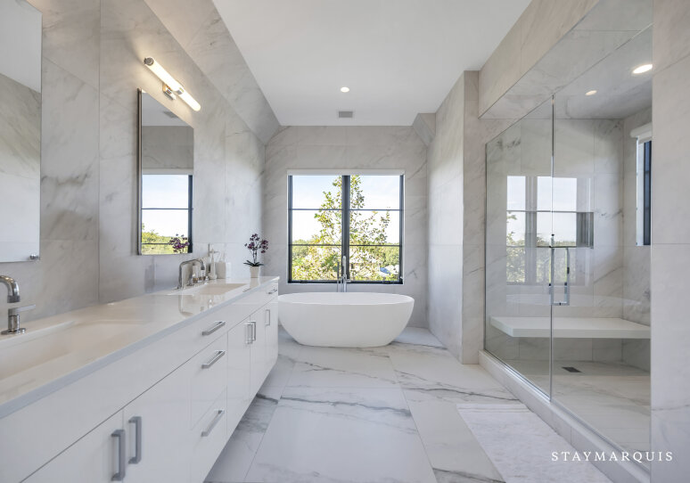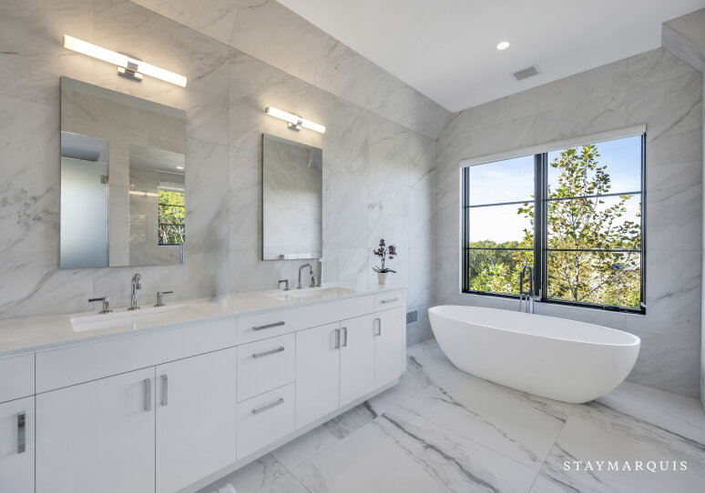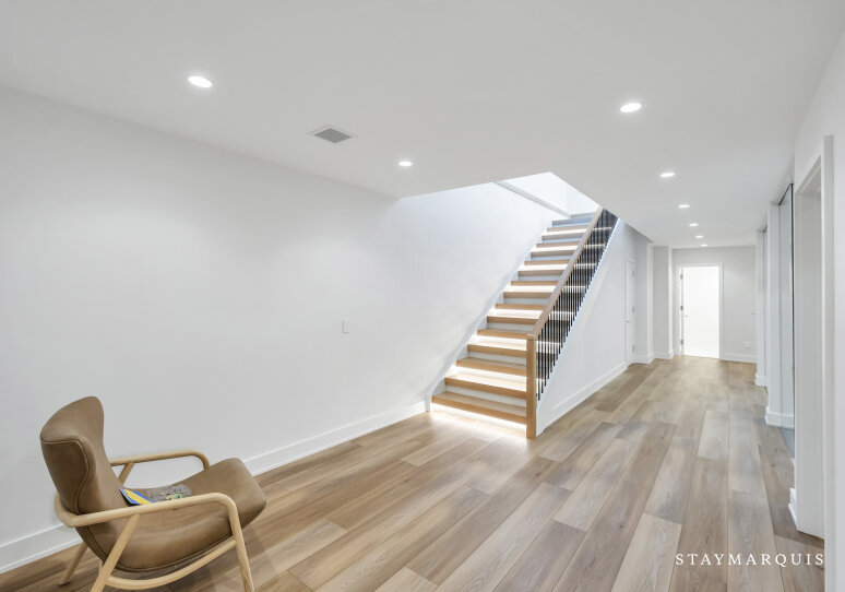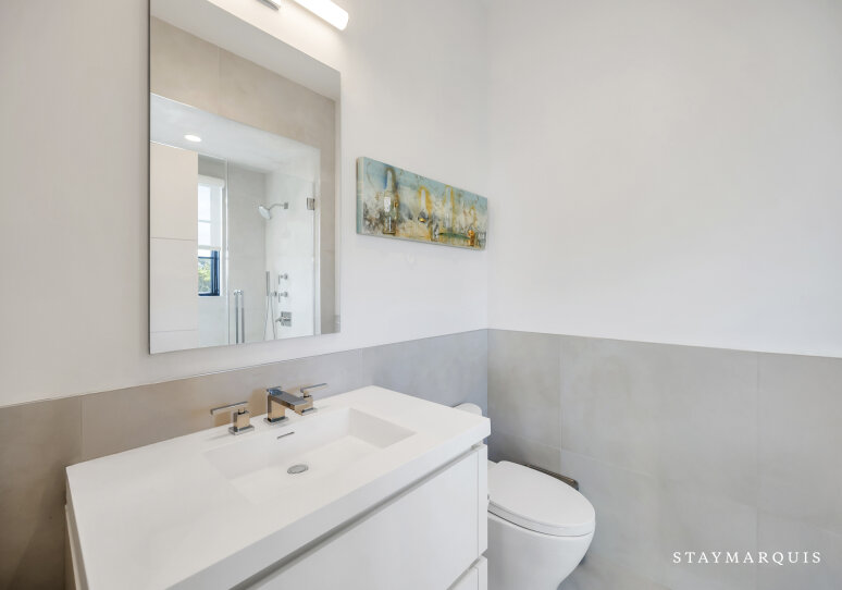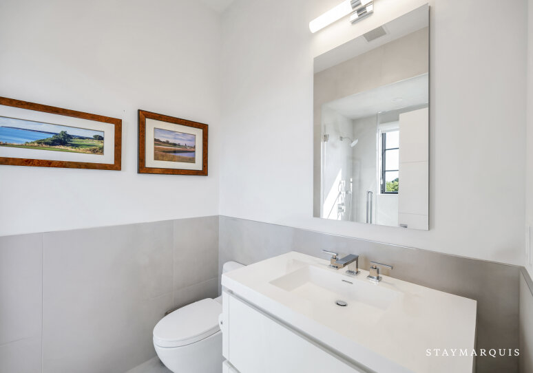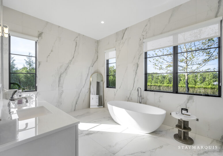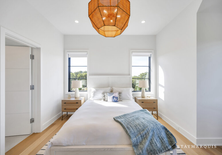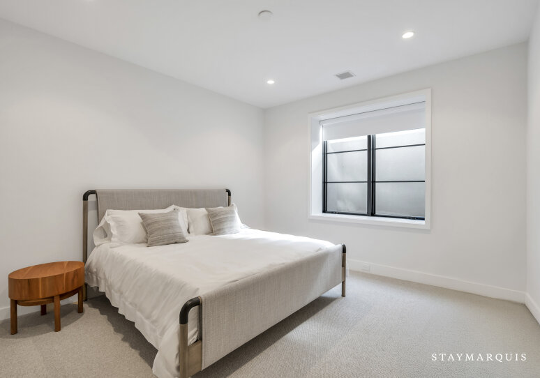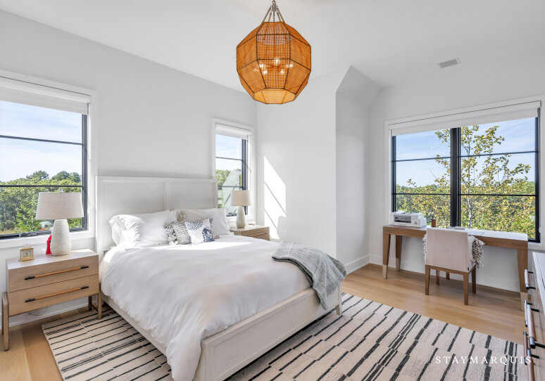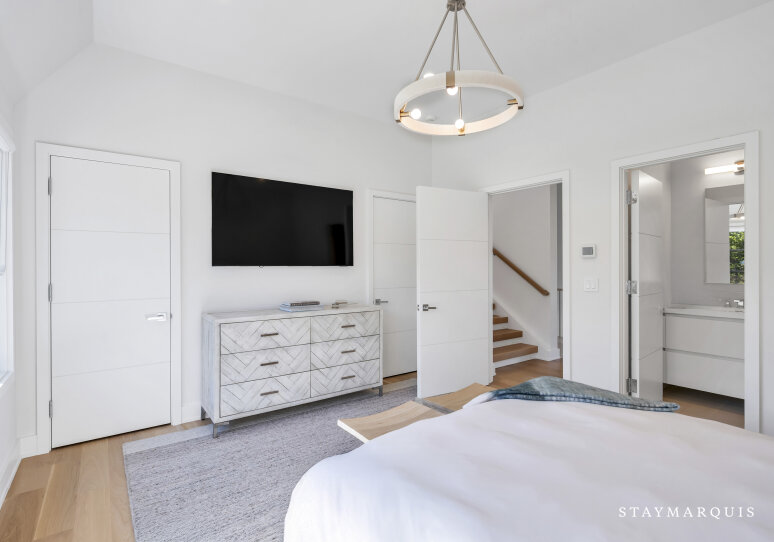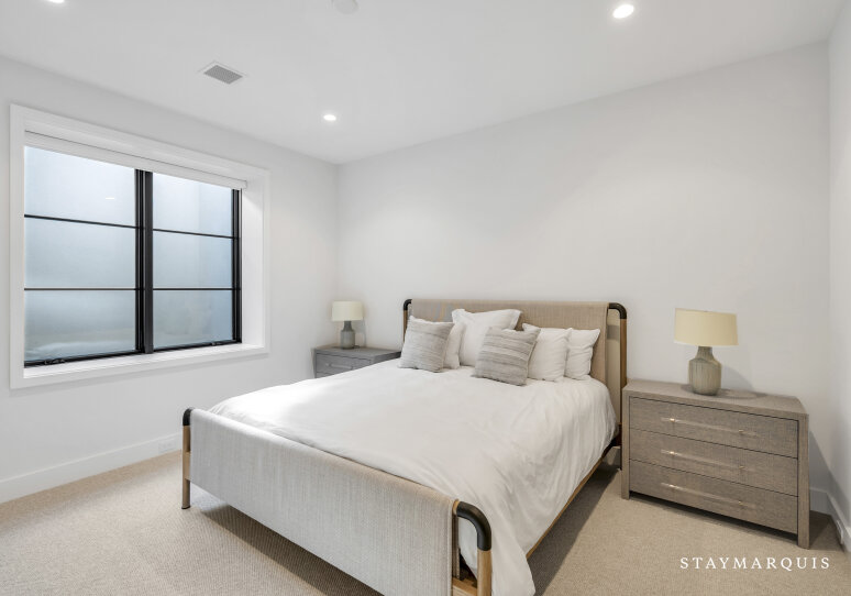 The bedrooms and bathrooms are a restful retreat after a day of entertainment. Each of the seven bedrooms features a king-size bed, calming décor, and fresh linens. The main-level primary suite opens to the backyard deck and includes dual walk-in closets and a spa-like ensuite with soaking tub, rain shower, and double vanity. The second-level primary suite offers a private deck with chaise loungers, dual walk-in closets, and a luxurious ensuite bathroom. Additional bedrooms on the second level have private ensuite bathrooms, while two lower-level bedrooms share a full bath. Two powder rooms provide added convenience for guests. Each bedroom has been thoughtfully designed to feel light, bright, and inviting, balancing comfort with style.