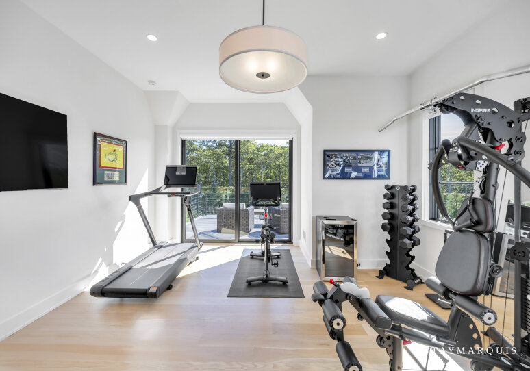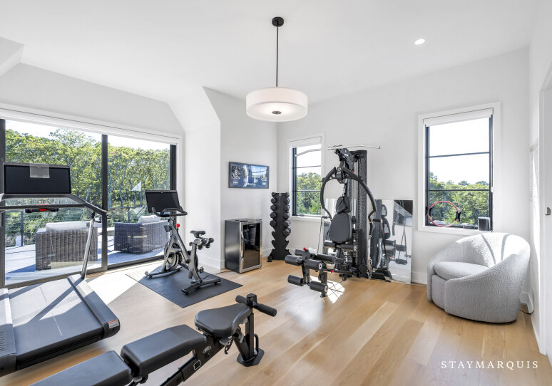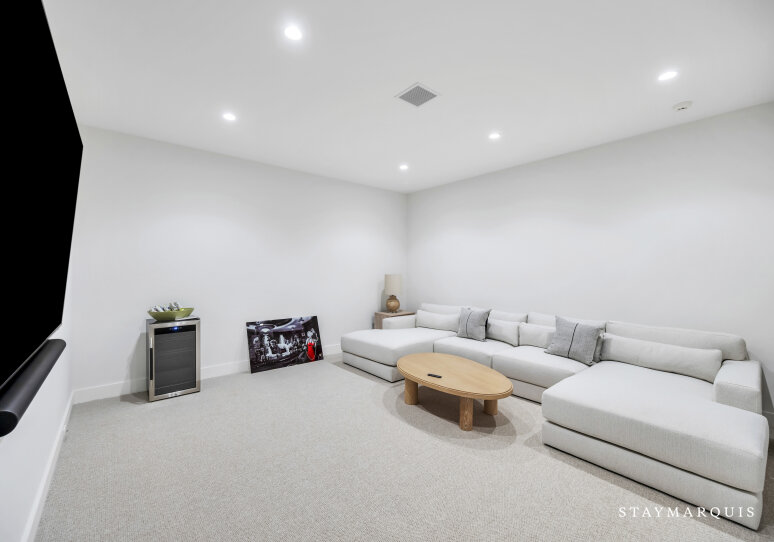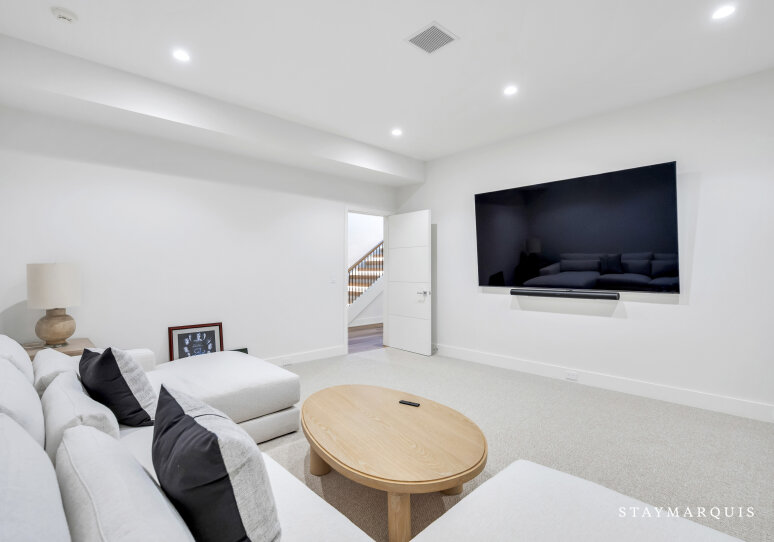 Entertainment options abound throughout the home. A dedicated lower-level movie room offers an immersive cinematic experience, while the fully equipped gym on the second level, complete with a private terrace and ensuite bathroom, allows guests to stay active in style. Multiple sitting areas inside the home provide spaces for games, conversation, or quiet reflection. Modern amenities, including high-speed Wi-Fi, central air conditioning, a work-from-home space, and laundry facilities, ensure guests enjoy convenience alongside luxury.