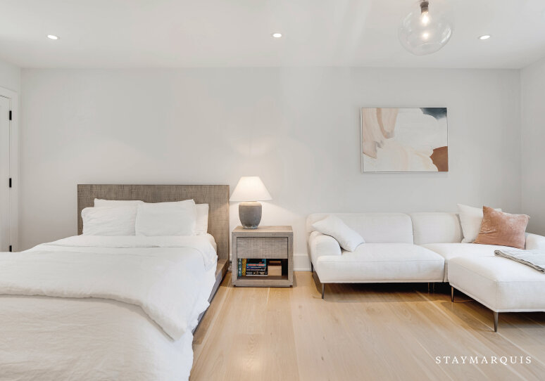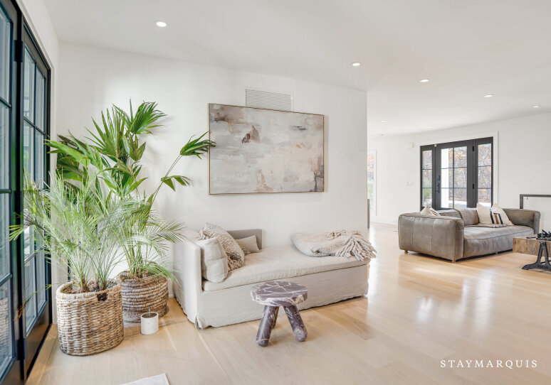 The five bedrooms are designed as tranquil retreats, with soft linens, plush bedding, and soothing color palettes creating a serene environment. The main house features three bedrooms and bathrooms, while the pool house provides two additional bedrooms and a full bath—perfect for guests seeking extra privacy or flexible accommodations. The mix of king and queen beds, along with thoughtfully provided essentials, ensures a restorative and comfortable stay for every guest.