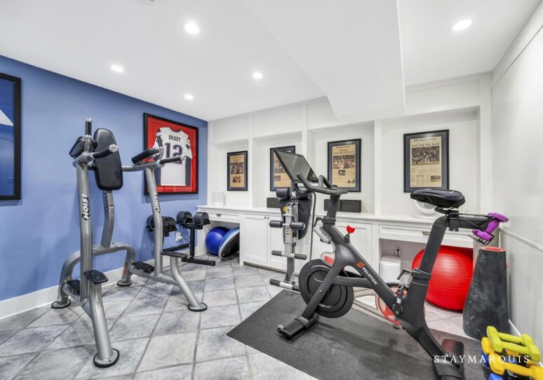 The exterior spaces are nothing short of exceptional, creating a private, resort-like experience surrounded by lush landscaping and total privacy. The private salt-water heated pool anchors the backyard and invites sun-soaked afternoons and refreshing dips throughout the day. The pool house with full bath and an outdoor shower adds a classic Hamptons touch after time spent at the beach or pool, while the covered patio offers a shaded space for lounging or dining al fresco. A gas grill makes outdoor meals effortless, whether it’s a casual lunch or a festive evening gathering. Younger guests will love the swing set, while bicycles provide an easy way to explore the surrounding area. For friendly competition and entertainment, a ping pong table adds hours of fun, and the on-site gym allows guests to maintain their fitness routine without ever leaving the property. Every outdoor element has been carefully considered to ensure both relaxation and recreation, all within a completely private setting.