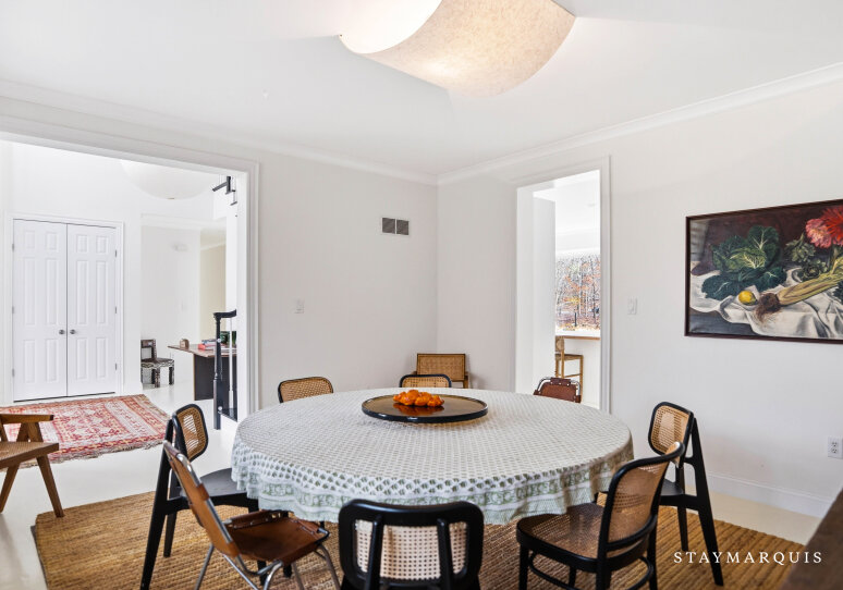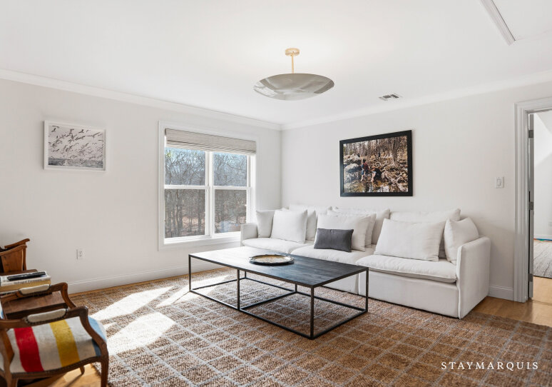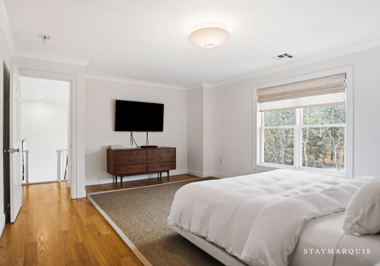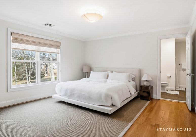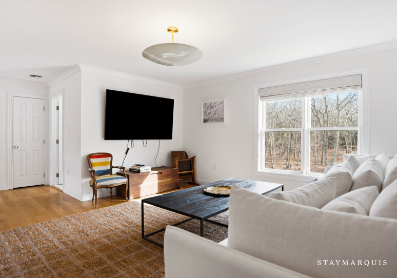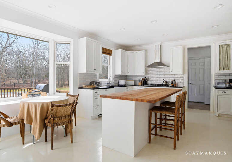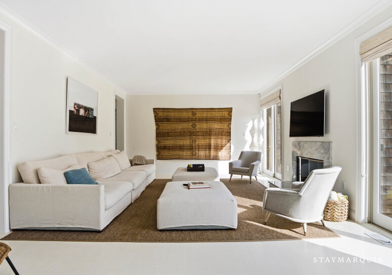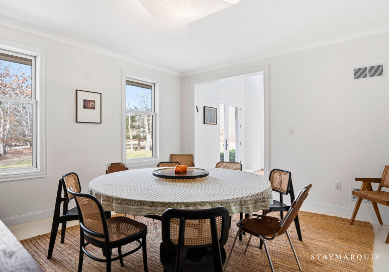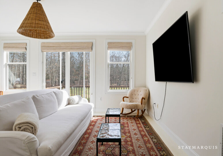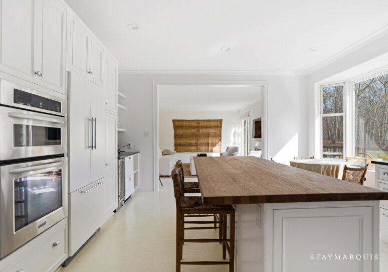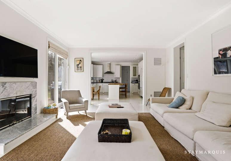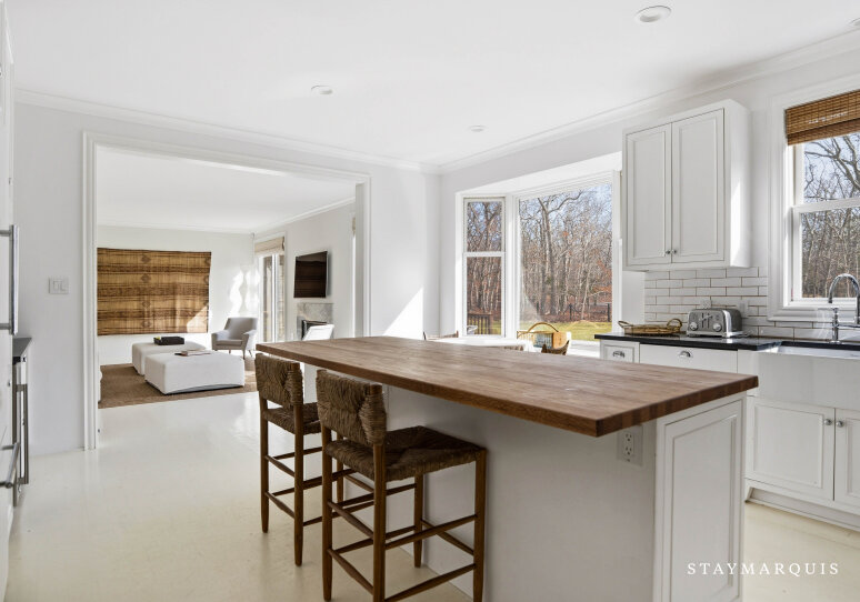 Experience luxurious living at this Nantucket-style traditional on a private compound in East Hampton. The 4,000 square-foot-plus home, abutting a 17-acre natural reserve, offers impeccable and effortless outdoor-indoor living. As you drive up, you will see the massive front lawn and extensive covered front porch, a perfect place to sit with a cup of home-brewed Nespresso coffee and bask in the crisp morning air. A bright entry foyer with soaring ceilings and natural light greets you as you walk inside. Relax in the great room, including a cozy wood-burning fireplace and a flat-screen TV, with sliding doors out to the yard on either side of the room. The great room then flows into the dining area and open kitchen. Whip up a hearty breakfast in the Chef’s kitchen with quartz countertops, white cabinetry, and top-of-the-line stainless steel appliances. A sizable island with two chairs provides additional space for meal prep and laying out hors d’oeuvres. There is a separate counter where you could work on your laptop and casual dining space with a table for four guests. Break bread in the separate formal dining room with a table that comfortably seats eight guests. Kick back in the media room with another flat-screen TV and another living space with a sectional couch and desk. Play relaxing background music inside and outside using the Bluetooth speaker system.